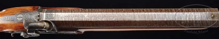 PAIR OF CASED WESTLEY RICHARDS 16 BORE PERCUSSION DUELING OR OFFICERS PISTOLS. SN 189. (Ca. 1833) Cal. 16 Bore. 9″ Octagonal twist smooth-bore bbls are engraved “Westley Richards. 170 New Bond St. London” on top flats with brass bead. Case hardened patent breeches have single platinum line at rear, scroll engraving on tops, and vented platinum blowouts. Breech irons have rear sight filed in, and are scroll engraved. Front action locks have rear mounted sliding safeties, and are engraved with decorative borders, and open flowing scroll. “Westley Richards” is on front of plates. Flat sided, serpentine hammers are scroll engraved, and have dolphin heads. Trigger guards have scroll engraving. SNs are on tips of tangs which mount into short trigger plate. Walnut stocks have rounded grips with flat top checkering with mullered borders. Wood of stocks extends to within 1/2″ of muzzles. Bbls fasten to stocks with side nail through oval silver escutcheons. Steel ramrods with button ends, mount in swivel at end of bbls. Mahogany case with shaped rectangular inset central medallion has flip-up carrying handle. Lid is secured with brass hooks and key lock. Interior is lined in green baize, with 2-covered compartments with bone knobs. No. 189 is written in pencil on wood under label. Westley Richards paper label is on inside of lid. Accessories include ebony handled turn screw, James Dixon German silver combination powder flask and ball magazine with 2 swinging covers at base, James Dixon small cylindrical pewter oil bottle, brass and ebony cleaning and loading rod with round horn tip., and 17 bore William Davis steel round ball mold stamped “Westley Richards London.” and “WD”. Lidded compartments contain patches. PROVENANCE: Peter Wainwright Collection. CONDITION: Excellent. Bbls retain 90-95% original twist pattern. Breech plugs, irons, and locks retain virtually all their original case hardened color. Trigger guards retain 60-70% of original fire blue, which is flaking. Stocks retain virtually all of their French polish finish with a few minor nicks and small dents through handling over the years. Locks are crisp. Bores are excellent. Case is very good with some added shellac on exterior, but is mostly smooth and shiny. Interior cloth is fine with a few areas marked from contact with guns. Label is fine, with some soiling. Accessories are very fine. 4-38194 MGM135 (7,500-12,500)