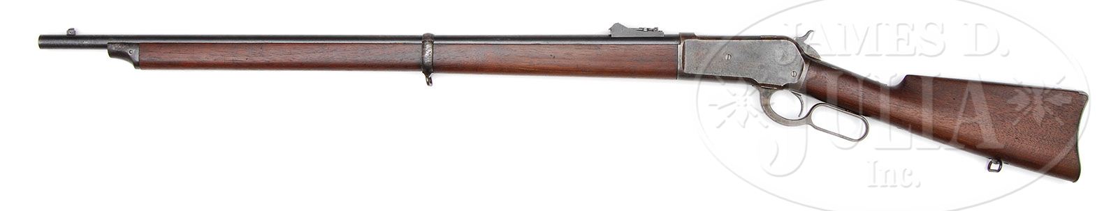 VERY RARE WINCHESTER MODEL 1886 LEVER ACTION MUSKET. SN 81878. Cal. 45-70. Standard grade musket with 30″ bbl, square base front sight/bayonet lug and ski jump 1,000 yard musket rear sight. Mounted with uncheckered, straight grain American walnut with full length forearm and straight stock with carbine/musket buttplate with trap containing an orig 5-pc all-steel cleaning rod. Forearm is secured with a sgl band and Model 1876 carbine/musket style forend cap. Bbl band has a sling loop with corresponding loop in the buttstock. Accompanied by an orig 18-1/2″ triangular socket bayonet with leather scabbard that has iron tip & white buckskin throat. Also accompanied by a Cody Firearms Museum letter which identifies this musket in caliber 45-70, received in warehouse Sept. 19, 1893 and shipped next day with 22 other arms to Order #24059. Also accompanied by a 3-page letter from renowned Winchester historian & author, George Madis, wherein he authenticates this musket and details much of the above information. According to Flayderman’s Guide to Antique American Firearms and The Winchester Book, Madis, there were only about 350 of these rare muskets ever produced, making them the most rare of Winchester lever action muskets except for the Model 1894 of which only five were produced as experimental prototypes. PROVENANCE: Barnes Family Collection. CONDITION: Very fine. Bbl retains about 90% strong orig blue with some light discoloration; receiver retains 70-75% orig case colors, bright on right side, faded & mixed with patina on left side & bottom; hammer retains about 80% bright case colors and the lever traces of case colors; buttplate retains some dark case colors on the tang. Wood is sound with a few, very light nicks & scratches and retains a hand worn patina. Mechanics are crisp, very bright shiny bore. Bayonet retains most of its orig bright polish on the blade, starting to gain a little patina on the socket; scabbard has a slight loss on the outer ridge, otherwise is sound and retains most of its orig finish with bright white buckskin throat. 4-47629 JR226 (15,000-20,000)