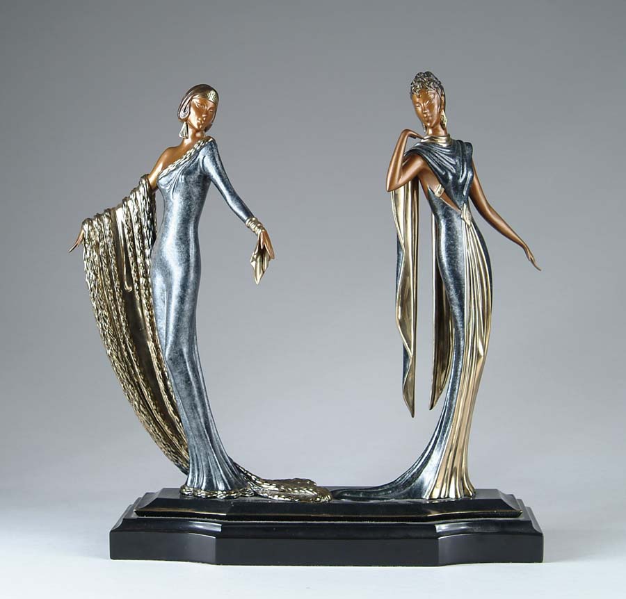ERTE BRONZE. Beautiful Deco bronze depicts two women in sleek long gowns with multicolored patination. The sculptures rest atop a black marble base. Marked on the back “491/500 c 1989 Sevenarts Ltd London”. Signed on base “Erte”. SIZE: 17” w x 19-1/2” t. CONDITION: Very good to excellent. 5-71277 (7,500-9,500)