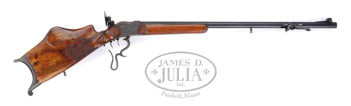 SCARCE GREGER ZIMMERSCHUTZEN. SN 5030. Cal. 5 mm RF. Beautiful deluxe Zimmerschutzen designed for indoor plinking. However the Germans took the sport seriously with these highly decorated accurate sub-caliber rifles that emulated the larger Schutzen rifles. They were used primarily for indoor matches in the taverns which were family type gathering places. This rifle has what appears to be a 29-1/2″ oct bbl with fluted edges of which only the last 7-1/4″ is actual bbl. Chamber for the tiny rim fire cartridge is on bottom of bbl, toward the muzzle which latches over a stud on bottom of bbl & when unlatched swings to the side exposing chamber for unloading & reloading. Beyond this feature this rifle exactly duplicates a full size Schutzen rifle with Martini style action. Mounted with very nicely figured French walnut with rounded forearm that has a carved tip & side panels with checkered triangle on bottom. Stock is typical heavy Schutzen style with checkered wrist & raised carved side panels to match the forearm. It has the heavy scalloped cheekpiece on left side with light incised carving & a thumb rest with large carved & checkered panel on right side. There is also a small amount of light incised carving on right side & bottom of thumb rest is carved to match forearm & stock side panels. It has a Schutzen style buttplate with short adjustable top tang & short bottom prong. Receiver has a Schutzen style finger rest trigger guard with dbl set triggers. Bbl has a full matted top flat with winged clock key adjustable ramp front sight that has two rotating posts. There is no provision for a rear sight and it has a clock key adjustable Schutzen style tang sight with large diopter disc. Left side of receiver is very nicely engraved with large vignette of a Bavarian gentleman with large mustache wearing a plumed hat with his rifle over his left shoulder & holding a beer stein in his right hand. Right side of receiver appears to be the same Bavarian gentleman wearing identical clothing with identical handlebar mustache holding his rifle over his right shoulder & a Calabash style pipe in his left hand. Top of receiver has light geometric patterns on top side flats with top flat having a stippled pattern. Top right flat of bbl is inlaid in silver “J. GREGER,” and left top flat is inlaid in silver “DILLIN GEN.”. PROVENANCE: Dr. Frank Miller Estate Collection. CONDITION: Extremely fine. Bbl retains about 98% strong orig blue with a very few small scattered spots of rust. Receiver, lever & buttplate retain generous amounts of orig case colors, mostly faded with strong colors in sheltered areas. Stock has a crack on each side of top tang, otherwise wood is sound and retains most of an old restored finish. Mechanics are crisp, bright shiny bore. 4-35645 JR448 (4,000-7,000)
