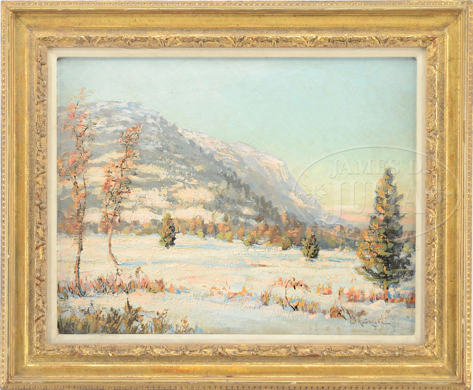 WALTER KOENIGER (American, 1881-1943) WINTER LANDSCAPE WITH COLORFUL MOUNTAINS. Oil on artist board Housed in a fine modern gilt frame with liner Signed lower right “W Koeniger” SIZE: 14″ x 18″. Overall: 19″ x 23″. CONDITION: Very good 7-70283 (1,500-2,500)