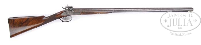 JOSEPH MANTON PERCUSSION DOUBLE SHOTGUN WITH CASE. SN 10553. (Ca. 1837) Cal. 16 Ga. 30″ Twist steel barrels with reinforced breech portion are engraved “Joseph Manton & Son. Patent. 6. Holles Street. Cavendish Square. London.” on wide concave top rib. Bottoms of bbls have SN, provisional proofs, and are stamped “TE” (Thomas Evans, barrel maker ?). Breech plugs have vented platinum blowouts, view proofs, and SNs on hooks. Ramrod is secured by 3 plain pipes. Ebony ramrod has German silver head, and brass tail, with worm under cap. Breech iron has finely executed scroll engraving. Front action locks are border engraved with very finely executed flowing open scroll. Lockplates are also engraved “Joseph Manton & Son Patentees”. Flat faced hammers have scroll engraving. Trigger plate and thimble are scroll engraved with stylized pineapple terminations. Trigger plate extends into the long tang with trigger guard bow attached. Tang is engraved with scroll, and SN. European walnut stock with nice dark marbling, measures 14-3/16″ over steel buttplate with long tang, which is scroll engraved. Coarse checkering with extremely elongated diamonds is borderless with ovoid termination toward lockplate. There is matching checkering on fore-stock. There is a vacant silver rectangular crest plate on top of grip. Bbl fastens to stock with side nail through oval escutcheons. Bore diameter: left -.657, right -.658. Wall thickness: left -.035, right -.037. Drop at heel: 2-3/16″, drop at comb: 1-3/4″. Weight: 6 lbs. 1.3 oz, LOP 14-3/16″. Mahogany case with brass corners and shield medallion in top, has hook closure. Interior is lined in blue cloth with paper Manton label. Accessories include very finely made pair of replacement hammers, matching the originals in every detail except depth and engraving. Also included are Eley’s percussion cap can with embossed brass top, ebony striker bottle with spare nipples, 3-pc ebony and brass cleaning rod, cocobolo handled turn screw, rosewood handled nipple cleaner, a nipple key, takedown steel and brass nipple key with pricker and nipples under caps, case hardened and polished steel mainspring vice, plain bag type powder flask by Bartram and Co., leather shot pouch embossed with hunter on horseback, and a very fine polished steel octagonal oil bottle. PROVENANCE: Peter Wainwright Collection. CONDITION: Very good. Bbls retain most of an old re-brown. Twist pattern is bold. Locks and furniture have traces of case color in protected areas, but are mostly silver and gray. Wood retains most of a hand oil finish with numerous marks from handling and use. Locks are crisp. Bores are very fine, bright and shiny. Nipples are modern replacements. Case is good with added shellac finish. Interior cloth is fine, with a number of rubs and separations from contact with gun. Label is good. Newer accessories are fine, older ones good. Mainspring vice and t-shaped nipple wrench are very fine. Oil bottle is excellent. A good solid gun. 4-38191 MGM132 (3,000-5,000)