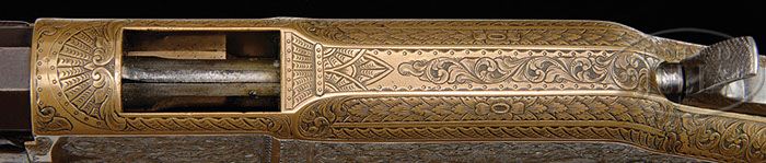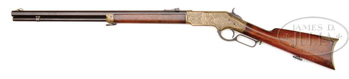 Additional Information: There are differences of opinion on the engraving. We therefore do not guarantee the engraver or the age of the engraving. SPECTACULAR NIMSCHKE ENGRAVED HENRY MARKED WINCHESTER MODEL 1866 LEVER ACTION RIFLE. SN 21028. Cal. 44 RF Henry. Fabulous ’66 rifle with 24-1/4″ oct bbl, full mag, German silver Rocky Mountain front sight and 900 yard Henry style ladder rear sight with slide retaining screw. Top flat of bbl is marked with the Henry’s and King’s patent 2-line address. It is mounted with nicely figured, uncheckered, slab sawed American walnut with straight stock and brass crescent buttplate with traps. SN is on bottom tang with last 3-digits of SN inside top tang channel of buttstock and inside toe of buttplate. Receiver is most spectacularly engraved by master engraver L.D. Nimschke in one of his most elaborate pieces of work accomplished over his sterling career. Receiver has nearly full coverage deep, semi-relief, intertwined and overlaid foliate arabesque patterns with very fine punch-dot background. Left side plate is engraved with the vignette of a bull elk being attacked by two dogs and a detailed forest scene. Right side plate has a scalloped edge, empty counterpoint panel with dot border and light shaded edges. Both front side flats are engraved with matching semi-relief foliate arabesque patterns and each panel has Mr. Nimschke’s mythical dog-like creature. The engraving continues over the entire top of the receiver and top tang with elaborate fan panels in front of the ejection port and behind the hammer slot. Top edges of the side plates and each side of the ejection port are engraved in feather patterns with elaborate, relief foliate patterns on each top side flat with Mr. Nimschke’s 4-petal flower blossom in the center. Bottom of the carrier is engraved with double rows of feather patterns with a matching 4-petal flower blossom in the center. He has engraved the area between and around the timing screws with foliate arabesque patterns and his full name “NIMSCHKE” on a ribbon in the center. He has added matching arabesque patterns around the lever opening, behind the trigger opening, around the lever lock with geometric patterns at the toe and a chip and dot border. He additionally added a beautiful ribbon around the SN. Forend cap is also more elaborately engraved than normal with foliate arabesque patterns on each side with feather and chip and dot border patterns around the edges. To complete the effect, Mr. Nimschke also engraved the buttplate tang and the buttplate more elaborately than normal with foliate arabesque patterns on the top of the tang and sides of the heel with the top of the heel engraved in a wonderful fan pattern. Side edges of the tang are engraved with feather border patterns with chip and dot border down the edges and, most unusually, a small pattern around the bottom screw hole. Given the extensive coverage with deep semi-relief engraving throughout, there can be little doubt that this rifle was ordered by or for someone of great importance. It does not appear to have been plated with either silver or gold. CONDITION: Fine. Bbl and mag tube retain blue in sheltered areas being mostly a smooth plummy-blue patina. Receiver retains sharp edges with only very light wear except at bottom front edge at carry point. Stock has a repaired crack in the toe with a couple spots of wood fill and a broken top tang screw, otherwise all wood is sound and retains a smooth restored finish. Mechanics are fine. Strong bore with moderate pitting. Cleaning rod is fine. 4-46968 JR290 (50,000-70,000)