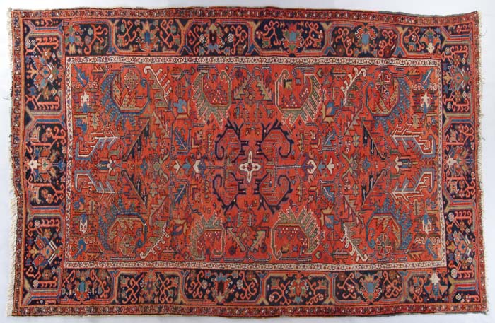 ROOM SIZE HERIZ ORIENTAL RUG. First half of the Twentieth Century. Soft colors in reds, blues, ivories and greens. The red field with allover decoration and wide black border with two other borders. SIZE: 10’ x 6’-7”. CONDITION: Generally very good, some loss to fringe ends. 9-72685 (800-1,200)