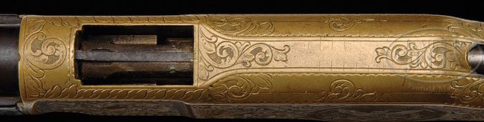 Additional Information: We do not guarantee this was engraved by the Ulrichs. BEAUTIFUL ENGRAVED WINCHESTER MODEL 1866 LEVER ACTION RIFLE. SN 156251. Cal. 44 RF Henry. Beautiful 4th Model ’66 with 24-1/4″ rnd bbl, full magazine, Marbles #2 ivory bead front sight and semi-buckhorn rear sight. Mounted with uncheckered straight grain American walnut with straight stock and crescent steel buttplate with trap. Forend cap is also of steel. Receiver is spectacularly engraved by one of the Ulrichs with full coverage on sides, consisting of incredible intertwined foliate arabesque patterns with very fine stippled background and fine chip & zig zag borders. Left sideplate is engraved with the large rnd vignette of a Mexican eagle with a fine crosshatch pattern at the front edge of the raised area. Right sideplate is engraved with an empty rnd counterpoint panel with matching intertwined foliate arabesque patterns. Both front side flats have small empty counterpoint panels. Engraving extends over top & bottom of receiver, top tang, forend cap & buttplate tang. Top rear edge of receiver on each side of hammer slot is engraved with a shell pattern and the bottom with a sunburst pattern. Left side of lower tang, under the wood is stamped with the assembly number “2297”. Top tang channel of buttstock is without an assembly number and the buttplate has the assembly number “58” inside the toe. This exact engraving pattern is pictured on a carbine on p. 87 in Chapter III “Model 1866 and the Ulrichs” of Winchester Engraving, Wilson. CONDITION: Fine. Bbl retains about 50% orig blue with the balance a plum patina; magazine tube retains about 95% strong orig blue; receiver shows light to moderate edge wear with crisp clear engraving; lever & hammer retain faint case colors turned silver-brown on outer faces of lever. Wood is sound with nicks & scratches and retains most of an old restored finish. Mechanics are fine, strong bore with good shine and light to moderate pitting. 4-41518 JR288 (25,000-35,000)