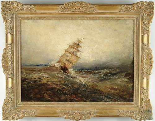 PAUL DOUGHERTY (American, 1877-1947) HEAD ON INTO THE STORM. Large oil on canvas marine scene shows tall ship coming at viewer through heavy ocean swells. Light reflecting in clouds indicate a lessening of the storm though sea in dark colors rages on. Signed lower left “Paul Dougherty”. Housed in what appears to be its outstanding original carved and gesso decorated gilt frame. Back of canvas in old writing indicates artist and “Address-Lester Studios 30? East 57th Street, NYC”. PROVENANCE: From a fine Baltimore, Maryland area home. SIZE: 22” x 30”. CONDITION: Very good. 9-98484 (5,000-10,000)