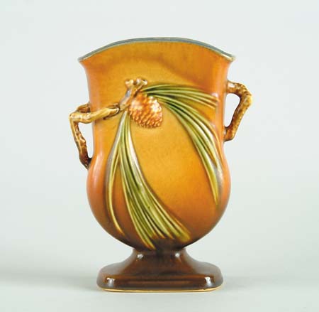 ROSEVILLE: “PINE CONE” TWO HANDLED VASE. Shape No. 121. Incised Roseville mark. Also a Roseville label. Orange background. SIZE: 7-1/4”. CONDITION: No chips or cracks. Very good to excellent. 9-96147-721 (100-200)