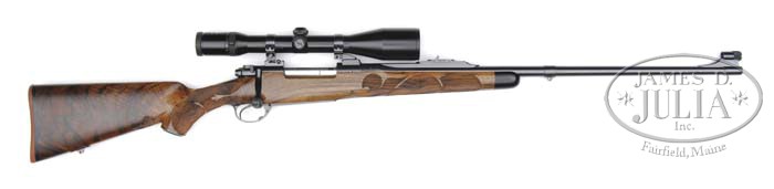 *SPECTACULAR JOHN BOLLINGER CUSTOM BOLT ACTION RIFLE WITH SCOPE. SN G297411. Cal. 7 mm STW. Beautiful custom rifle by a well known maker with 26″ tapered sporting weight bbl, sleeve ramp front sight with hood and quarter-rib with 2-leaf, sight (1-standing, 1-folding) and mounted with EAW quick release/return-to-zero bases and rings containing a Zeiss Divari-Z 2.5-10X48 T* scope with medium duplex crosshairs. Receiver is a customized Model 70 action with custom checkered bolt release and jeweled bolt body, rails & follower with jeweled long claw extractor and 5-panel teardrop checkered bolt knob. Mounted with spectacular French or Circassian walnut half stock with 14″ LOP over a thin Pachmayr, red, Old English pad and beautiful custom ribbon & fleur-de-lis checkering. Stock also features right hand palm swell and finely sculpted volute near checkered bolt release. Custom trigger guard & floorplate have a trigger guard mounted floorplate release. It has rosewood forend tip with engraved steel grip cap. Butt stock has a wonderful sweeping cheekpiece with Kimber style sling base in a raised pedestal on bottom and a corresponding stalking swivel base around bbl. Weight: 10 lbs. 2 oz. with scope. Accompanied by two 25 rnd boxes of Nosler Custom brass and a Redding precision die set w/ micrometer bullet seater. CONDITION: Extremely fine plus. Overall retains about all of its fine custom finish to both metal & wood with only a few minor handling & use nicks & scratches in butt stock. Scope has mounting scratches, otherwise is extremely fine with crisp optics. Mechanics are crisp, brilliant shiny bore. 4-45022 (8,000-12,000)