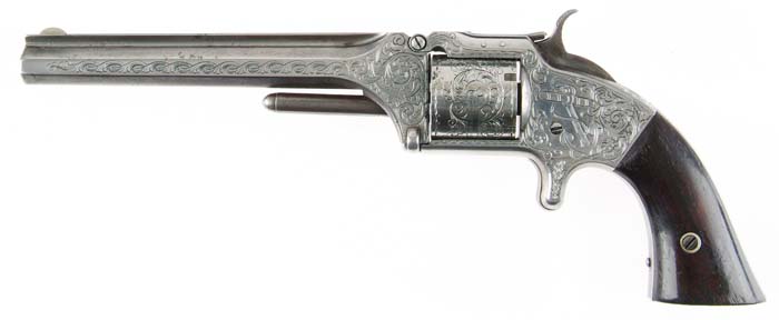 ENGRAVED SMITH & WESSON NO. 2 ARMY REVOLVER. Cal. 32 S&W Long RF. SN 39382. Nickel finish with 6” keyhole bbl, half moon, German silver, front sight with smooth 2-pc rosewood grips that are matching numbered to this revolver. This revolver is engraved by L.D. Nimschke in patterns identical to those found on p. 23 of L.D. Nimschke Firearms Engraver, Wilson. They consist of 50-60% coverage fine intertwined foliate arabesque patterns with punch dot background and a large fouled anchor on sideplate with some cross-hatching on opposite side. Backstrap & buttstrap are engraved also. Cyl has 75-80% coverage matching engraving. Accompanied by a Smith & Wesson factory letter identifying this revolver as having been shipped May 30, 1865 to J.W. Storrs, New York City, NY, Smith & Wesson’s sole agent from 1856-1869. It was in a shipment of 75 mixed revolvers, all with plain finish. This letter also identifies it as Nimschke engraved. CONDITION: Very good, all matching including grips. Retains 30-40% orig finish with balance cleaned to bright metal. Orig finish is possibly silver plating, but being polished bright, appears to be nickel. There is some scattered fine pitting, mostly around forcing cone area with heavier pitting on face of cyl. Hinge pin screw is a replacement and may be stripped. Grips show moderate to heavy wear with a couple of minor chips on edges and retain 30-40% orig varnish. Mechanics are fine, strong dark bore. Baldwin Collection 4-30015 JR108 (3,000-6,000)