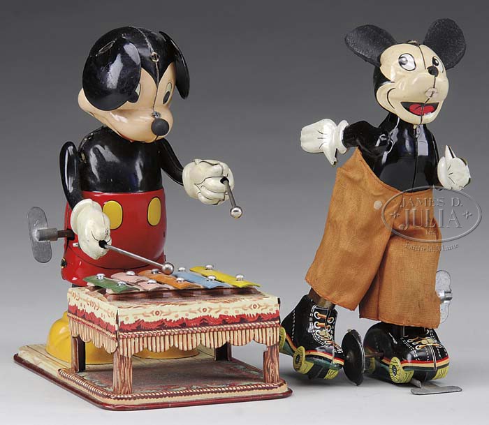 TWO LINEMAR WIND-UP MICKEYS. 1) Rollerskating Mickey. Mickey pushes off with rollerskating action. 2) Mickey Mouse at xylophone. Spastic Mickey hammers instrument as body and ears flop. SIZE: Tallest: 6-1/2″ h. CONDITION: 1) Replaced ears, fading to clothing. Overall good and working. 2) Complete, very good and working. 1-10933, 1-10934 (300-600) Auction: Advertising, Toy & Doll - Spring 2011 Please Note: All prices include the hammer price plus the buyer’s premium, which is paid by the buyer as part of the purchase price. The prices noted here after the auction are considered unofficial and do not become official until after the 46th day. |