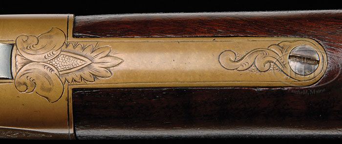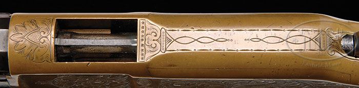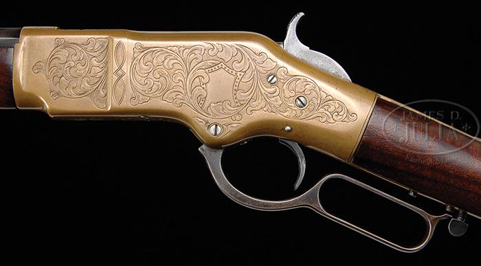 Additional Information: We do not gurantee this was engraved by Nimschke. FINE NIMSCHKE ENGRAVED WINCHESTER MODEL 1866 LEVER ACTION RIFLE. SN 109705. Cal. 44 RF Henry. Usual configuration with 24-1/4″ oct bbl, full magazine, half nickel front sight and 900 yard ladder rear sight. The 2-line Winchester & King’s Patent address is completely legible. Mounted with very nicely figured, uncheckered American walnut with straight stock & brass crescent buttplate with trap. Bottom of stock & forend cap have factory sling swivels. Last four digits of matching SN are in top tang channel of buttstock and inside toe of buttplate. Receiver is very nicely engraved by master engraver, L.D. Nimschke, in his distinctive large sweeping foliate arabesque scrolls with punch dot background. Left sideplate has an empty scalloped edge panel with stars in the border and the right side has full coverage foliate arabesque patterns. The vertical raised land area before the front flat on each side is engraved in a geometric pattern. Engraving extends over the top of the receiver with a foliate spray forward of the ejection port and matching spray behind the hammer slot. Bottom of receiver has Mr. Nimschke’s distinctive foliate pattern between the timing screws and a beautiful hunter star on the carrier. Forend cap and buttplate tang are engraved to match. This rifle was, undoubtedly, the prize possession of someone of relative importance to either have received it as a gift or to have been financially able to purchase it. CONDITION: Fine. Bbl & magazine tube retain blue in sheltered areas being mostly a cleaned thin blue/gray patina; receiver shows moderate edge wear and it, along with the buttplate and forend cap, retain a smooth medium mustard patina. Wood is sound with a few, very light handling & storage nicks and retains about all of a fine refinish. Mechanics are crisp, strong dark bore with fine pitting and a fine ring about 2″ from muzzle that did not bulge the bbl. 4-41516 JR287 (22,500-32,500)