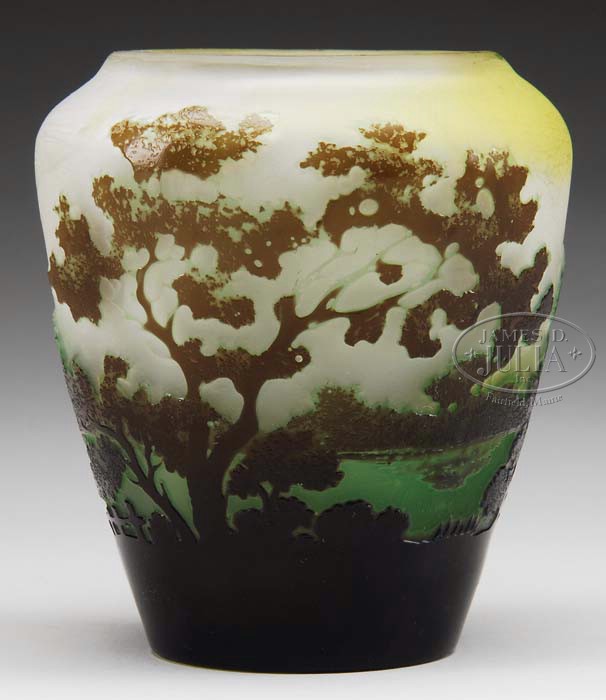 GALLE CAMEO VASE. Japanese garden scene is created in a multitude of earthen green hues set against a vibrant yellow and frost ground. Scene depicts a large tree in the foreground with lush foliage in the mid to background. Signed on the side in cameo “Galle”. SIZE: 4-1/4″ t. CONDITION: Very good to excellent. 5-69337 (1,200-1,500)