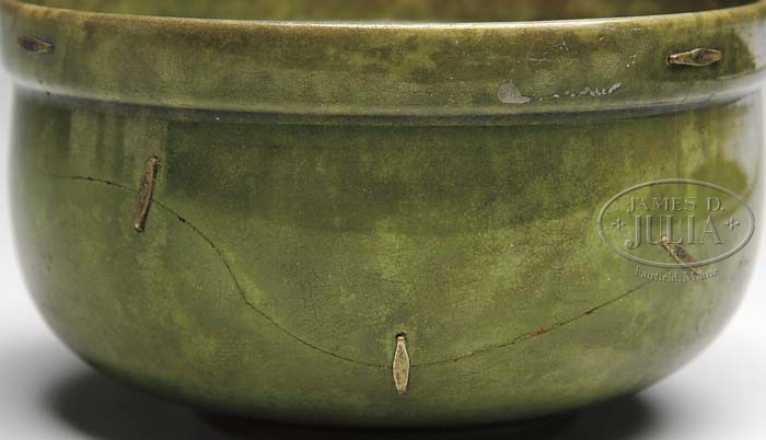KOREAN FLORAL DECORATED BOWL IN OLIVE GREEN GLAZE. Early 19th century. The round bowl with stepped rim decorated with a floral spray along one side. SIZE: 3″ h x 5-1/2″ dia. CONDITION: Rim with 1″ chip. Side with old U-shape staple repair and with craquelure. 9-22168 (200-300)