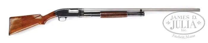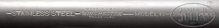 *EXTREMELY SCARCE WINCHESTER MODEL 12 32″ SOLID RIB STAINLESS BARREL. SN 495341. Cal. 12 ga. 32″ stainless steel bbl, with matted solid rib, sgl silver sighting bead, 2-3/4″ chamber, FULL choke. Left side of bbl is marked “STAINLESS STEEL-MADE IN U.S.A./WINCHESTER/TRADEMARK-MODEL 12-12GA. FULL”. Right side of bbl has a series of patent dates. Standard receiver with serrated top. Mounted with nicely figured straight grain walnut, semi-pistol grip, Winchester hard rubber buttplate, 18-ring field forend. Bore diameter: -.729. Bore restrictions: -.033. Wall thickness: -.049. Drop at heel: 2-38″, drop at comb: 1-5/8″. Weight: 7lbs. 13oz. LOP 13-3/4″. CONDITION: Very good. Bbl retains a gray stainless finish lacking all of its Japan black. Mag tube retains some orig blue blending with silver patina. Receiver has some orig blue in protected areas with some added cold blue and some spots of minor surface oxidation. Stock is sound with some minor nicks & scratches and light handling marks and retains a coat of added finish. Forend is sound with a minor hairline crack, some minor nicks & dings, and retains some orig finish blended with hand worn patina. Mechanics are good with a shiny bore. 4-40096 BDT32 (3,000-5,000)