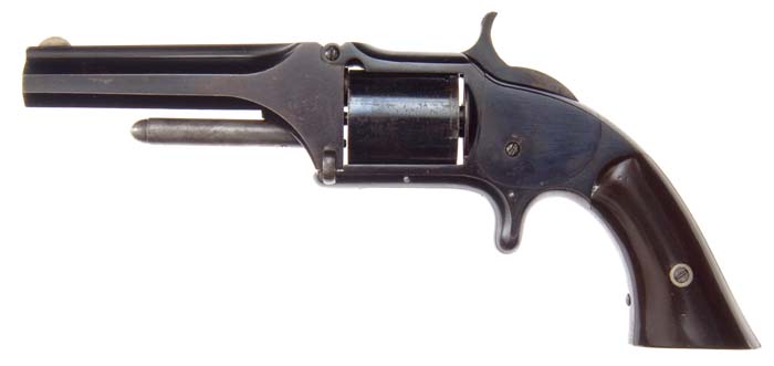 SMITH & WESSON MODEL 1-1/2 OLD MODEL SPUR TRIGGER REVOLVER. Cal. 32 RF. SN 23536. Blue finish with 3-1/2” oct bbl with full rib, German silver, half moon front sight and usual markings on rib. It has 5-shot cyl with 2-pc rosewood grips numbered to the revolver. CONDITION: Very fine to extremely fine, all matching including grips. Overall retains about 95-96% glossy orig factory blue with some light flaking on bbl & cyl, with the loss areas a light patina. Cyl has a fingernail sized spot of fine pitting, which has been cleaned. Mechanics are crisp, strong bright bore with a few scattered spots of light pitting. There is a screwdriver mark on the sideplate. Grips are extremely fine retaining virtually all of their fine piano varnish. 4-30705 JR419 (2,000-3,000)