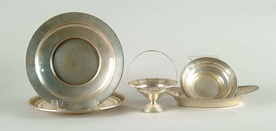 FIVE STERLING TABLE ARTICLES. 1) 9” monogrammed plate. 2) 9-1/4” Alvin plate. 3) 9-1/2” x 5-1/2” reticulated oval dish. 4) 5-1/2” reticulated round dish. 5) 5-1/2” fixed handle weighted basket. CONDITION: Generally good, some minor dings. 9-97926 (100-200)
