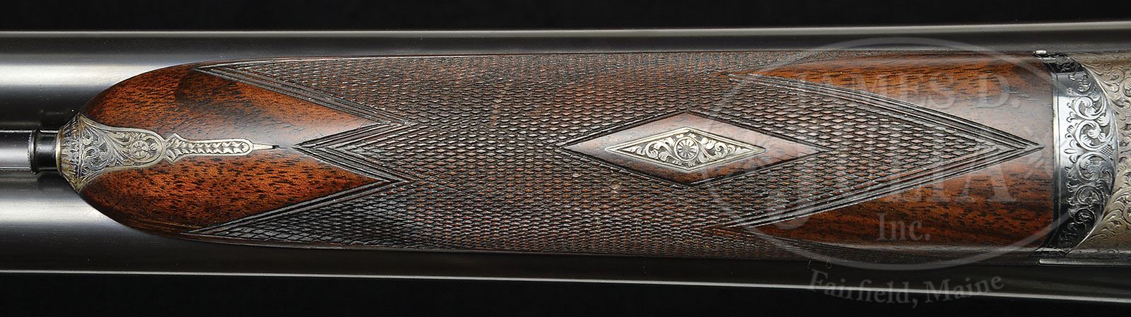 Additional Information: The 20 ga. gun has an invisible repair at the wrist. The only reason we are aware is the former owner called and informed us of said repair. *CASED SET OF WESLEY RICHARDS 12 GA. AND 20 GA. SIDELOCK EJECTOR SINGLE TRIGGER GAME GUNS WITH EXTRA BARRELS. SN 19176/ 19178. (1963) Cal. 12 ga./ 20 ga. 2-3/4″ Chambers. 12 ga. bbls are 26″ and 30″, 20 ga. bbls are 26″ and 28″. All bbl sets have matted Churchill game ribs, and are engraved “Westley Richards & Co” and “Birmingham, England” on tops. Bbl flats are stamped with 1963 Birmingham nitro proofs for 2-3/4″ chambers. Case hardened Holland & Holland style full sidelock actions by Brown Brothers (logos on interior of sidelocks) feature H & H style lock detaching pins, non-automatic safeties (SAFE inlaid in gold), side clips, hidden third fasteners, gold band tumbler end cocking indicators, and gold-plated Miller single selective triggers. (Original double trigger parts and interceptors are in case.) Actions are engraved with cleanly cut, large, open, shaded scroll. “Westley Richards” is on the front of each lockplate. Blued top levers and trigger guards are also scroll engraved. SNs are on trigger guard tangs. Well figured and nicely marbled European walnut straight grip buttstocks measure 15″ over brown leather covered pads, and feature drop points, diamond hands, classic point pattern checkering with mullered borders, and incised rectangular crest plates on toe lines engraved “W H W”. Matching splinter ejector forends have Anson releases. 12 ga. 26″ bbls: Bore diameter: left-.729, right -.729. Bore restrictions: left -.007 (IC), right -.004 (IC). Wall thickness: left -.023, right -.023. Drop at heel: 2-1/2″, drop at comb: 1-1/4″. Weight: 6 lbs. 10 oz. LOP: 15″. 12 ga. 30″ bbls: Bore diameter: left-.729, right -.728. Bore restrictions: Screw chokes. Wall thickness: left -.027, right -.027. Drop at heel: 2-1/2″, drop at comb: 1-5/16″. Weight: 6 lbs. 14 oz. LOP: 15″. 20 ga. 26″ Bbls: Bore diameter: left-.613, right -.613. Bore restrictions: left -.004 (IC), right -.002 (IC). Wall thickness: left -.027, right -.031. Drop at heel: 2-5/16″, drop at comb: 1-1/4″. Weight: 5 lbs. 14 oz. LOP: 15″. 20 ga. 28″ Bbls: Bore diameter: left-.613, right -.613. Bore restrictions: Screw chokes. Wall thickness: left -.029, right -.031. Drop at heel: 2-5/16″, drop at comb: 1-1/4″. Weight: 6 lbs. 0 oz. LOP: 15″. Large, deep, leather motor case with stitched leather corners and two latch closure, is lined in green baize, and has gold embossed, black leather, makers label on lid, has room for both guns with extra bbls, in removable top tray. Case contains three 12 ga, and two 20 ga. Briley choke tubes in plastic holders (two tubes of each gauge are installed in bbls), 2 choke tube wrenches (for 12 ga and 20 ga), two walnut and brass 2-pc cleaning rods with mops, jags, and brushes, envelopes containing removed trigger and interceptor parts, and a pair of Westley Richards marked snap caps for each gun. PROVENANCE: Factory facts with details of these guns. CONDITION: Excellent. Bbls retain approx 95% orig blue (30″ 12 ga bbls re-blued, and retain nearly all of that blue). Actions retain 85 – 90% orig case hardening color, silvering on bottoms, beads, and fences. Lockplates retain nearly all of their orig case hardening color. What appears to be orig blue of trigger guards, is only slightly silvered, as are top lever thumbpieces. Stocks have only a small number of handling marks and rubs in their orig finish, checkering slightly worn. Bores are smooth, bright and shiny. Actions are tight. Bbls are on face. Ejectors are in time. Single triggers work. Along with installation of Miller single triggers, long bbls have been fitted with Briley thin wall chokes, and have had forcing cones lengthened. Leather of case is excellent with only a few minor bumps and rubs. Handle is strong, straps replaced. Interior cloth is excellent, with some compressions from contact with guns and bbls. Accessories are very fine to excellent, showing some rubs. A finely finished, unusual set. Factory records indicate that only six shotguns were produced by Westley Richards in 1963, two pairs and two singles. During this time most of the guns built were sidelocks. 4-47793 MGM29 (40,000-50,000)