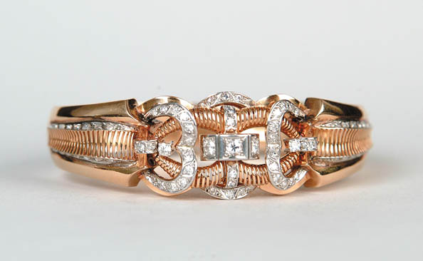 FABULOUS 18KT GOLD AND GENUINE DIAMOND BUCKLE SHAPED BRACELET. This beautiful old bracelet with a genuine diamond clasp on the rear opens on the hinge. The front encrusted with genuine cut diamonds, set in the form of interlocking buckles. Bracelet is solid gold but not marked. Probably 18kt but guaranteed to be at least 14kt. CONDITION: Very good. 3-30387 (4,500-5,500)