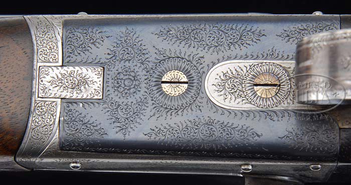 J. PURDEY AND SONS BOX LOCK 12 BORE RIFLE WITH ORIGINAL CASE, ACCESSORIES, AND EXTRA SET OF SHOTGUN BARRELS. SN 13802. Cal. 12 Ga. 2-1/2″ Chambers. Rifle bbls are engraved “J. Purdey & Sons. Audley House, South Audley Street, London.” on plain flat top rib w/ two folding leaf express sight dovetailed through rib, brass bead front sight. 28″ Chopper Lump steel bbls. Full length rifling is present, and described, in factory letter as: “barrels 28″ with rifled three shallow grooved for shot or ball Whitworth steel, mounts for 50 and 100 yards”. Also “Extra D Quality Barrels fitted, bored cylinder and modified.” Rifle bbl flats show Birmingham nitro proofs for 2-1/2″ at .729, and are marked “Trademark D Quality”. SN “13802” (1890) is stamped on bottoms of bbls w/ Whitworth nos. “16782” and “16783” on loop. Bottom rib is engraved “Made of Sir Joseph Whitworth’s fluid – pressed – steel.” (Whitworth steel was an extra cost option on D Quality guns.) The 30″ steel shotgun bbls are engraved “J. Purdey & Sons, Audley House, South Audley Street, London.” on flat plain game rib w/ wedge of scroll engraving at breech end. Bbl flats have early London nitro proofs for 2-1/2″ chambers and are marked “Trademark D Quality”. Left bbl is stamped “choke” and SN is stamped on both bbls. Box lock action has London view and Birmingham nitro proof marks, “802”, “Trademark D Quality”, and “Anson & Deeley’s Patent 10065” on water table. Action is engraved with about 60% coverage well executed English scroll, w/ nicely filed beads around fences. “J Purdey & Sons” is engraved on both sides of action. Trigger guard has scroll and SN engraved. “Safe” is inlaid in gold in front of automatic safety button on top tang. Top lever is marked “Patent”. Nicely marbled straight grip European walnut buttstock measures 14-3/4″ over checkered horn butt plate, and features 20 LPI checkering w/ mullered borders, drop points, and silver oval engraved w/ “J. H. M. from G. S. B. 1897”. Note: Lid of case is also marked “J. H. M.” Anson release splinter forend has wood and checkering to match buttstock. Barrel Set number 1 (Rifle): Bore diameter: left -731, right -734. Bore restrictions: left -.000, right -.000. Wall thickness: left -.044, right -.040. Weight:7 lbs 2 oz. Barrel Set number 2 (Shotgun): Bore diameter: left -731, right -731. Bore restrictions: left -.022, right -.000. Wall thickness: left -.030, right -.031. Weight: 6 lbs 13 oz.Drop at heel: 2-1/8″, drop at comb: 1-1/2″. Leather case has brass corners, and brass central medallion with initials “J. H. M.” embossed on lid. Interior is lined in scarlet cloth w/ James Purdey paper label, and another label with charges for breech loading gun no. 13802. Case contains 2-pc ebony cleaning rod, ebony wad rammer and hand-held roll crimper both marked “J. Purdey & Sons 12”, Davis improved no. 13 round ball mould with no. 13802 stamped on one leg, pair of 12 ga. snap caps, 3 shipping/ inventory labels dated 1960 and marked “Col. Sanford”, Extra barrels are housed in heavy leather tube case w/ carrying strap. PROVENANCE: Copy of factory email. CONDITION: Very good. Rifle bbls retain virtually all London quality re-black. Shotgun bbls retain 90% of what appears to be original blue, w/ some slight freckling, and very small area of pitting under forend tip. Action retains 10% case color in protected areas around action beads. Floor plate and top lever retain most of their re-blue. Trigger guard retains 20%-30% original blue. Buttstock retains most of its original oil finish w/ numerous marks from handling and use. Checkering is slightly worn. Forend checkering is slightly dirty w/ one fairly deep ding toward the iron. Action is tight and on face with both sets of bbls. Bores and chambers are excellent, bright and shiny on both sets of bbls. Case leather is scuffed. Handle is missing. Interior is very good. Partitions are tight. Accessories are near excellent. Mould shows some heat discoloration from use. It is interesting to note that Purdey’s produced fewer than 425 double barrel hammerless rifles of all grades between 1880 and 2000. It appears that this rifle is their answer to Holland and Holland’s Paradox. A very interesting and perhaps unique rifle. 4-37411 MGM10 (13,500-17,500)