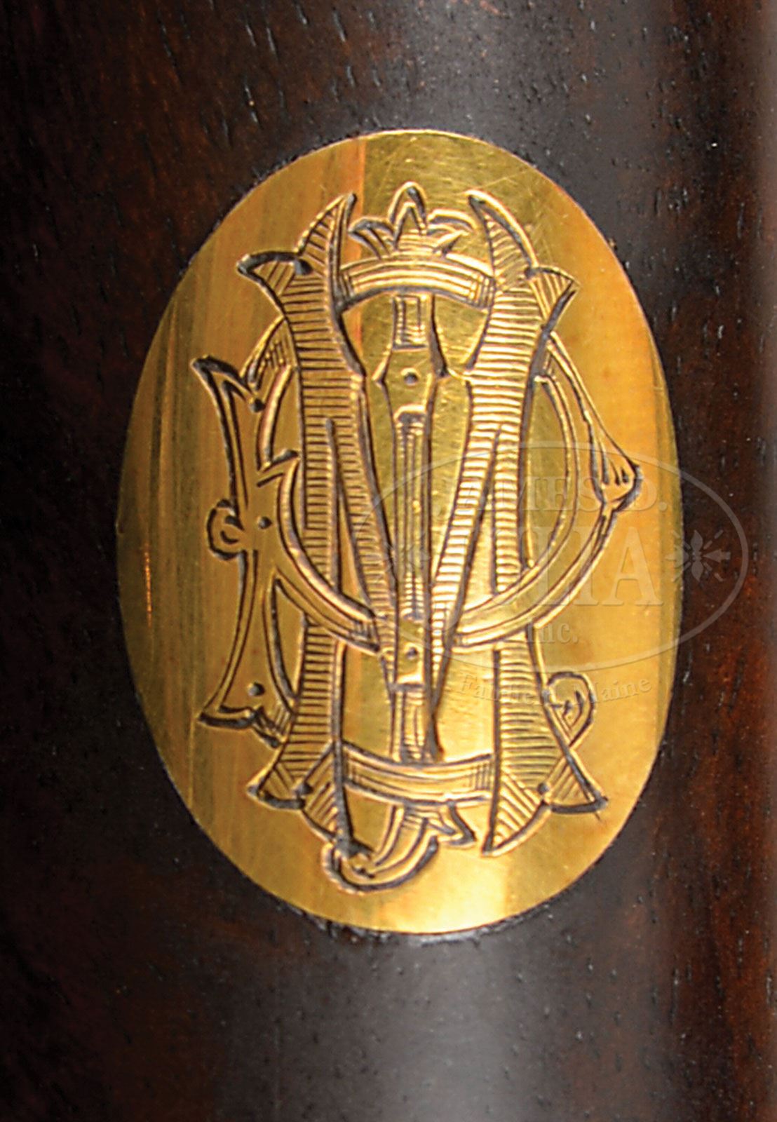 *J. P. MORGAN, JR.’S EXCEPTIONAL PAIR OF HENRY ATKIN SIDELOCK EJECTOR SINGLE TRIGGER HEAVY GAME GUNS WITH ORIGINAL CASE. SN 2832/ 2833. (1927) Cal. 12 ga. 3″ Chambers. This fine pair of guns (gold inlaid “1” and “2” in the usual places), ordered on 5 Oct. 1927, were “required for duck shooting” and to have 30″ barrels and 2-3/4″ chambers with the same measurements as the ordinary 12 bores. Beautifully struck 30″ chopper lump bbls are engraved “Henry Atkin Ltd (From Purdey’s) 88 Germyn St London. S. W.” on narrow, swamped game rib. Bbl flats are stamped with London nitro proofs for 1-1/4 oz of shot and “2-3/4″”. SNs are stamped on bottoms of bbls. Case hardened, Purdey type, self-opening actions are built on a Henry Atkin adaptation of Beasley’s famous patent, whereby the internal parts were shaped so as to make the guns easier to close than in “other” self-openers. The ejector system was also improved. Actions feature automatic safeties (SAFE inlaid in gold), bushed strikers, and single non-selective triggers. Actions are engraved with exceptionally well cut, small, shaded scroll surrounding rose bouquets, in classic British “best” style. “Henry Atkin” is engraved on the bottom of each lockplate, and on bottom of actions over “From Purdey’s”. Trigger guards are engraved with open, flowing scroll, and with SNs on short tangs. Well matched, dark, well veined and nicely figured European walnut straight grip buttstocks measure 14-1/2″ over coarsely checkered wood butts, and feature drop points, classic point pattern checkering with mullered borders, and gold ovals on toe lines engraved with monogram, “JPM”. Matching splinter ejector forends have Anson releases. Gun no. “1”: Bore diameter: left-.728, right -.727. Bore restrictions: left -.014 (Mod), right -.003 (IC). Wall thickness: left -.026, right -.024. Drop at heel: 2-1/4″, drop at comb: 1-1/2″. Weight: 7 lbs. 4 oz. LOP: 14-1/2″. Gun no. “2”: Bore diameter: left-.729, right -.728. Bore restrictions: left -.016 (Mod), right -.004 (IC). Wall thickness: left -.028, right -.025. Drop at heel: 2-1/4″, drop at comb: 1-1/2″. Weight: 7 lbs. 3 oz. LOP: 14-1/2″. Makers oak and leather two gun case with brass corners is embossed “J. P. M.” on top. Case retains its canvas outer cover with leather trim and extra pockets, which also has central leather tag embossed “J. P. M.”. Interior of case is lined in scarlet cloth, and has black leather, gold embossed Henry Atkin label on lid, with secondary label which instructs: “NOTE. To insure proper working it is essential, when opening this gun, that the barrels should be dropped smartly to their fullest extent.” Case contains high quality 2-pc ebony and brass cleaning rod with mop and jag, a black morocco leather wallet containing pull through cleaning equipment, and two pairs of snap caps marked “Henry Atkin London”. PROVENANCE: From the family of banker and philanthropist, J. P. Morgan, Jr. with letter explaining the order of family ownership. Henry S. Morgan Jr. Estate Collection. CONDITION: Excellent. Bbls retain nearly all of an old high quality re-blue with slight silvering at muzzles and on ribs. Engraving remains sharp and clear. Actions retain most of their orig case hardening color, vivid where protected, considerably silvered on fences, action beads, and thinning on bottom. Lockplates retain over 90% of their orig case hardening color. Stocks retain most of their orig oil finish, which is quite dry, with a number of light marks and scratches from normal handling and use. Gun no. “1” has a deeper scratch at rear of action. Gun no. “2” has some deeper scratches on right side of butt. Both guns have some denting at toes. Bores are excellent. Actions are tight. Bbls of gun no. “1” are on face. Gun no. “2” have bbls slightly off face and is “down on the flats”. Ejectors are slightly out of time on both guns. Triggers work. Guns have been in storage for a very long time and can do with a good cleaning. Case leather is very fine with some staining. Outer cover has considerable mold and mildew from poor storage. Some straps of outer cover are detached and missing. Straps and handle of case are good. Interior cloth is fine, with some marks and compressions from contact with guns, and considerable mildew. Accessories are fine. Label is excellent. Secondary label is oil soaked and foxed. Case should clean up nicely. 4-49127 MGM181 (25,000-35,000)