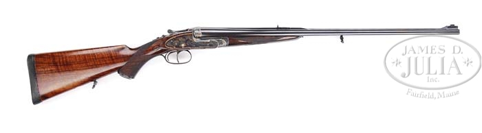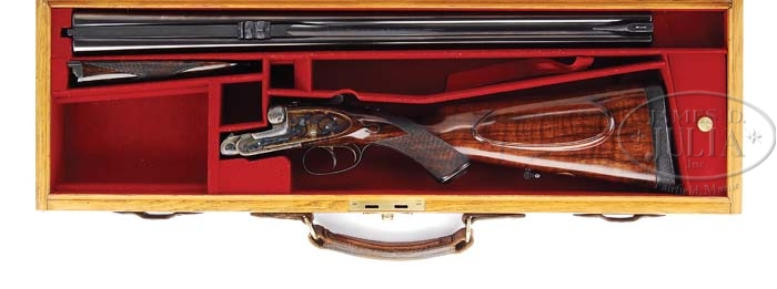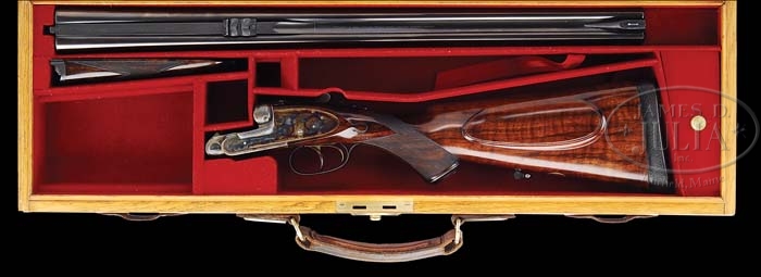 *J. PURDEY SIDE LOCK EJECTOR DOUBLE RIFLE WITH DIES AND CASE. SN 25576. Cal. 369 Purdey. This fine rifle has 25″ steel chopper lump bbls engraved “J. Purdey & Sons, Audley House, South Audley Street, London” on the wide concave top rib in front of matted quarter rib with third bite extension. One standing, two folding express sight has platinum lines and is marked on the backs of leaves with 200 and 300 yards. Silver front bead is longitudinally dovetailed into shaped and matted raised base. Bbl flats show London nitro proofs for 369 2-3/4″ case 61 grains cordite and 270 grain bullet. SN is stamped on bottoms of bbls. Barrelers initials “SS” (Sam Simons) are on left bbl. Tube nos “63229” and “63230” are on the loop. Sling eye and loop are soldered to bottom rib. Beesley patent self opening action features automatic bolted safety with “Safe” and “Bolted” inlaid in gold, side clips, extension third fastener, heavy bolsters and double triggers. Action and lock plates have 80% coverage of very finely executed Purdey House style bouquet and scroll engraving. Lock plates are engraved “J. Purdey & Sons”. Bottom of action is engraved “J. Purdey & Sons, London England”. Trigger guard has stylized scroll, SN, and tang extends to engraved steel grip cap. Nicely figured and lightly streaked European walnut full pistol grip buttstock measures 14-3/4″ over leather covered pad, and features double shadow line right hand cheek piece, 24 LPI checkering with mullered borders, sling eye with loop, drop points, and gold oval with monogram “APM”. Anson release splinter forend has engraving, wood, and checkering to match balance of rifle. Actioners initials “SW” (Whitehouse?) on forend iron. Drop at heel: Approx 2-1/2″, drop at comb:Approx 1-3/4″. Weight: 8 lbs. 8.6 oz. Makers oak and leather case has brass corners, central medallion, and canvas outer cover, and is stamped “369” in lower right hand corner of top. Interior is lined in red baize with leather Purdey label. There are recesses cut into lid for sights. Included with rifle are 2 boxes of cartridges loaded by Ken Owen for this rifle(producing 2″ groups at 80 yds), forming and reloading dies, and five boxes of Kynoch 369 Purdey cartridges. PROVENANCE: Accompanied by a Purdey factory letter confirming the gun’s configuration and stating completion in June 1942 for Maharajah of Mysore.It is interesting to note that by June 1942, London was deep in the throws of WWII and very few non-essential items were being produced. A target shot by Ken Owens confirming performance also accompanies the lot. CONDITION: Excellent, as refinished. Bbls show virtually all of a glossy London quality re-black. Action shows 90% of a St. Ledger Quality re-case color. Silvering on beads, tops of bolsters, and top lever. Engraving is slightly washed. Wood shows most of a good quality oil finish with a few handling marks. Bores have strong rifling, slightly dark and frosted in grooves. Action is tight. Bbls are on face. Drop shows some wear. Forend iron touching action. Case is fine with few marks and scuffs in leather. Interior is fine, partitions are tight with two places where the cloth has been cut by action. Straps are new replacements. Handle is strong. Fewer than 425 Purdey hammerless double rifles were produced in all grades between 1880 and 2000. This is a fine example in a great caliber. 4-38165 MGM17 (55,000-85,000)