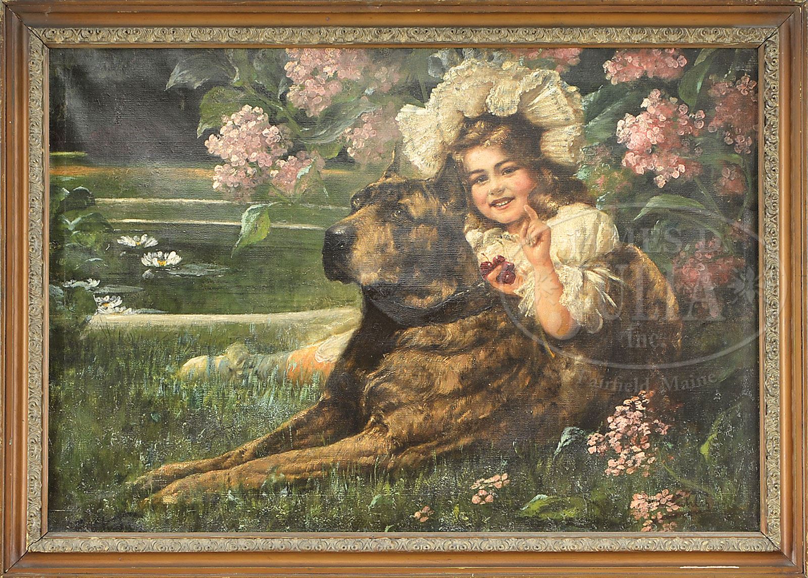 CARL KAHLER (American/Austrian, 1855-1906) MY BEST FRIEND. Oil on canvas Housed in a gesso decorated gold frame Signed lower right “Kahler” SIZE: 26″ x 38-1/2″. Overall: 30-3/4″ x 43-1/4″. CONDITION: Very good. 9-90358 (1,000-1,500)