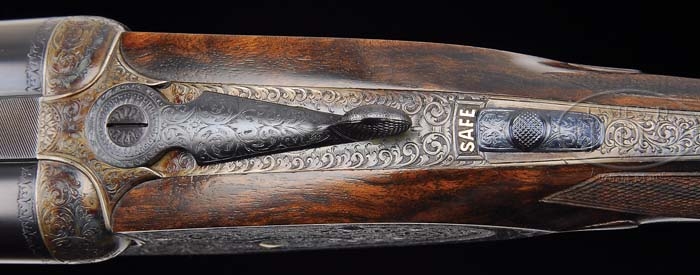 *HOLLAND AND HOLLAND ROYAL HAMMERLESS DOUBLE RIFLE WITH ROUNDED ACTION BAR MADE FOR MAHARAJAH GANGA SINGH OF BIKANER. SN 17915. (Ca. 1903) Cal. 500/ 450 Nitro Express. 26″ Chopper lump bbls have typical Holland and Holland file cut quarter rib with one standing, two folding leaf express sight with platinum lines, and marked for 100, 200, and 300 yards. Silver bead front sight with porcelain flip-up night sight is longitudinally dovetailed into Holland style raised front base. Bbls are engraved “Holland & Holland. 98. New Bond Street. London” and “Winners of all the “Field” Rifle Trials. London.” on tops. Bbl flats show London nitro proofs for 450 express, “70 grains cordite”, and “480 grains bullet.” Bottoms of bbls have SN and Whitworth steel sheaf of wheat trademarks. Sling eye with loop is soldered to bottom rib. Action features rounded bar, back action side locks, automatic safety (“Safe” inlaid in gold), bushed strikers, hidden third fastener, double triggers (front trigger checkered), gold band tumbler end cocking indicators, and long top tang which extends over comb. Action and side plates are engraved in typical Holland house style open shaded acanthus scroll with “Holland & Holland” in ribands on lock plates. Bottom of action is engraved “Charge”, “70 grains cordite,” “500/450”, and “Case 3-1/4″”. Trigger guard has scroll on bow, SN on tang which extends to engraved trap grip cap. Dark fully marbled European walnut full pistol grip buttstock measures 15-1/4″ over leather covered pad, and features sling loop, vacant gold oval, right hand Holland style cheek piece, drop points, and 20 LPI checkering with mullered borders. Matching splinter forend mounts to bbl with forward lever. Drop at heel: Approx 2-3/4″, drop at comb: Approx 1-7/8″. Weight: 10 lbs. 7 oz, LOP 15-1/4″. Accompanying rifle are buttstock and forend of an older generation of a restock. PROVENANCE: Copies of page from auction catalog listing background of this rifle, and invoice from Holland & Holland to renovate, re-blacken bbls, shoot and test, June 23, 1997. CONDITION: Excellent, as refurbished. Bbls retain virtually all of a factory re-black. Action and side locks retain virtually all London quality re-case color. Buttstock and forend are very high quality replacements, possibly factory. Action is tight. Bbls are on face. Bores are bright and shiny with strong rifling. Some evidence of erosion at throat especially in right bbl, which also has a few minor pits. 4-38641 MGM67 (30,000-40,000)