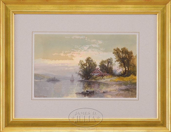 CHARLES DAY HUNT (AMERICAN, 1840 – 1914) EARLY EVENING CRUISE. Watercolor landscape shows a one-masted sailboat on calm water passing by a house on shore under trees. A beautiful pastel sunset sky reflects in the water. Signed lower left. Housed in a fine modern gilt molded wood frame and lavender gold lined mat. SIZE: Sight size: 9-1/2″ x 15-1/2″. CONDITION: Very good. 9-97176 (400-600)