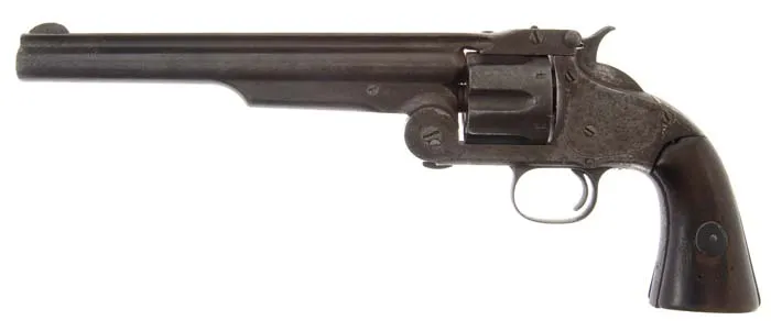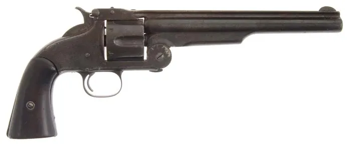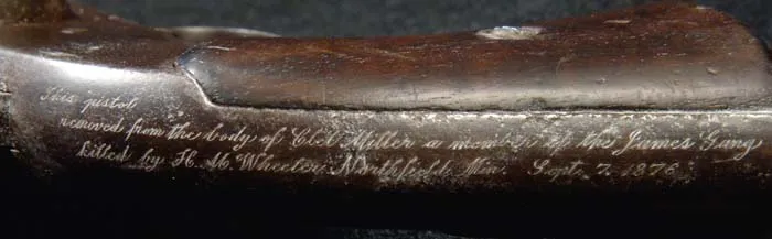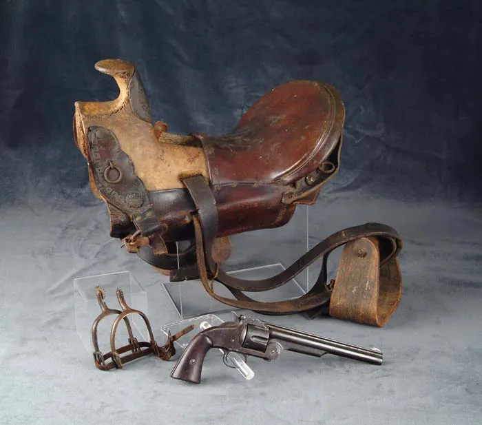 LOT OF ITEMS SEIZED FROM JAMES GANG OUTLAW CLELL MILLER AT THE NORTHFIELD, MINNESOTA BANK ROBBERY. This lot consists of a Smith & Wesson Second Model American revolver, an early half seat saddle with bent wood stirrups and a pair of brass spurs. These items were the property of Clell Miller, a member of the James/Younger Gang which attempted to rob the First National Bank of Northfield, MN on Sept. 7, 1876. The gang entered the town in three different groups with Jesse & Frank James and Bob Younger entering the bank, while Cole Younger & Clell Miller acted as guards in the street with the remaining three members of the gang guarding the escape route over the bridge leading out of town. When the Northfield citizens became aroused and starting shooting at the gang and Frank & Jesse couldn’t force the teller, Joseph Haywood, to open the safe, they decided to abandon the robbery and attempted to escape. In the meantime a young medical student, Henry M. Wheeler, at home in Northfield on vacation, who had just been turned away from the bank by Clell Miller, raced to the hotel where he knew there was an old Civil War carbine and some ammunition. He grabbed the carbine and the only three cartridges available and took a position in an upstairs window where he killed Clell Miller and wounded Bob Younger in the elbow. Another outlaw, Bill Chadwell, was also killed by a Mr. Manning. The remainder of the gang managed to escape even though they were all wounded, some severely. Once the shooting had stopped Mr. Wheeler returned to the street where he removed the revolver & spurs from Miller’s body and took possession of Miller’s horse & saddle which, according to family history, he rode for many years until the horse died. The two dead outlaws were summarily buried in Northfield but Mr. Wheeler, knowing that his medical school was in need of cadavers for dissection & study, disinterred the two bodies, packed them in barrels of water labeled “FRESH PAINT” and shipped them back to his medical school. The family of Clell Miller, learning of the situation, demanded return of his body which was allowed before any dissection took place. The other outlaw, Bill Chadwell, was not claimed and so was dissected & studied at the medical school. Family history & some newspaper accounts report that Dr. Wheeler then cleaned Chadwell’s skeleton, reassembled it and maintained it in his medical office for many years, pointing out to any interested visitor the bullet lodged in the skeleton’s spine. The revolver, as previously noted, is a Smith & Wesson 2nd Model American, caliber 44 American, SN 18550, with 8” keyhole bbl, half moon front sight and 2-pc wood grips. Butt strap has a plugged lanyard stud hole and it has traces of orig nickel finish. Backstrap is engraved in period script “This pistol removed from the body of Clel (sic) Miller a member of the James Gang killed by H.M. Wheeler Northfield Min. Sept. 7. 1876”. Accompanied by a notarized letter dated 8 September 1965 and signed Floyd Wheeler, Rome Hiway, Kingston, GA. In the letter Mr. Wheeler states that H.M. Wheeler was his great-grandfather and relates the story of Mr. Wheeler killing Clell Miller and taking Miller’s revolver, spurs & saddle, also Miller’s horse which he rode form many years. Floyd Wheeler states in the letter that he is trading “the pistol, spurs and saddle to Robert Patterson owner of Pattersons Hardware Rome, Georgia, for two Model 42 Winchesters and a Parker shotgun.” Also accompanying is another notarized letter dated Nov. 13, 2006 signed Everett Mealor, stating that he had heard that Robert had traded for “an outlaw’s gun, saddle and spurs.” and that 35 years later he was able to acquire all the above items. CONDITION: The revolver is used & worn, maintaining a mottled, dark brown patina with traces of orig nickel and light surface pitting. Grips are heavily worn with replaced screw & escutcheon. Mechanics are a little loose but functional, strong pitted bore. Spurs are Civil War style with small rowells with one side of one shank broken away with a rusted replacement rowell and rivet. The other rowell has several broken points and overall are both a dark coffee colored patina. Saddle is dry with some crackling in seat and on front leathers but reasonably intact. Of all the famous outlaw items to come to market in recent years, this is the only grouping with iron clad authentication. It is from one of, if not, the most famous or infamous incidents in Western outlaw history. 8-76199 (75,000-125,000)