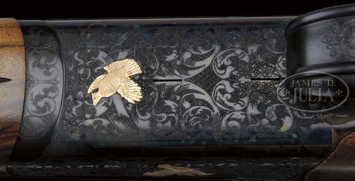 *UNIQUE CSM RBL SPECIAL LAUNCH EDITION SIDE BY SIDE SHOTGUN WITH CASE. SN RBL004081. Cal. 20ga, 28″ bbls, tapered concave rib, single brass sighting bead, SCREW chokes, 2-3/4″ chambers, ejectors and single selective trigger. Top of right bbl marked “RBL LAUNCH EDITION 20ga. 2-3/4” and left “CONNECTICUT SHOTGUN MFG. NEW BRITAIN CT. USA”. Side of each bbl has 1″ wedge of scroll engraving and top rib a 1/2″ wedge of scroll engraving. The upgraded Special frame with bold foliate scroll with shaded background has the addition of gold quail in flight on left side and gold grouse in flight on right and bottom. Mounted with exhibition walnut, checkered straight grip, serrated hard rubber buttplate, checkered beavertail forend, and dbl rolled-edge trigger guard. Gun is optioned with assisted opening, beavertail forend and single selective trigger. Bore diameter: left -.618, right -.617. Bore restrictions: left -SC, right -SC. Wall thickness: left -.032, right -.034. Drop at heel: 2-1/2″, drop at comb: 1-1/2″. Weight: 6lbs. 8oz. LOP 14-3/4″. Accompanied with factory dark blue luggage case and all accessories. Starting retail price for this gun is $7,995. CONDITION: Extremely fine, as gun appears new and test-fired only since manufacture. All surfaces retain 100% of orig factory finish as gun appears to be test-fired only. Mechanics are crisp with automatic safety, strong ejectors and shiny new bores, as gun appears test-fired only. Case and accessories are equally new. 4-40881 BDT146 (4,750-5,750)