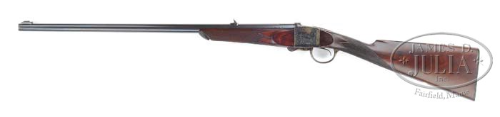 VERY RARE MacNAUGHTON TRIGGER PLATE ACTION SINGLE SHOT FALLING BLOCK 450 RIFLE WITH CASE. SN 1171. Cal. 500/450 #1. 26-3/4″ Round Steel bbl w/ Nock form is engraved “James MacNaughton, 26 Hanover St. Edinburgh.” on the top w/ one standing, one folding express sight w/ platinum lines and sighted for 100 and 300 yds. transversally dovetailed through a small block. Platinum bead front sight is longitudinally dovetailed through a block base. Left rear of bbl is stamped w/ London provisional and definitive black powder proofs and “.440”. Case hardened action is marked “MacNaughton’s patent no.127/1171” on both sides and “Patent no. 127” in filed circular flat on top of receiver ring. This is the patent use number which refers to the famous MacNaughton trigger plate patent as used in many celebrated double guns. Action is also engraved w/ fairly large shaded scroll. The floor plate is engraved w/ feather motif and SN “1171”. The lever has matching scroll engraving. The relatively plain straight grip reddish European walnut buttstock measures 14-1/4″ over a checkered horn butt plate, featuring side panels, round German silver crest plate and 18 LPI checkering w/ mullered borders. Alexander Henry type forend is attached to the bbl w/ screw, w/ wood, panels, and checkering to match buttstock. This is the same rifle as is pictured and described in Jonathan Kirton’s THE BRITISH FALLING BLOCK BREECH LOADING RIFLE from 1865. This rifle has undergone complete restoration since the publication of the book. Reproduction cherry and oak case has brass hook fasteners. Interior is lined in red cloth w/ reproduction James MacNaughton paper label. CONDITION: Very fine as restored. Bbl retains 85%-90% original blue, thinning and flaking toward breech, and around muzzle. Action retains virtually all of its high quality re-case color. Stocks retain virtually all their restored finish. There are some areas of repair on right hand side of buttstock near action, and a few small chips missing near rear of bottom tang. Breech block and trigger are polished bright. Action is tight. Strong bore is shiny w/ evidence of some frosting and very light pitting at throat and muzzle. Case is near excellent w/ a few scuffs. Very scarce rifle w/ only five examples being listed in Kirton, and one of the very few actually listed in MacNaughton records. This one is identified as “Edinburgh hammerless express single rifle” and was sold in 1894 to P. Campbell of Perth. Very few of these rifles were made because of a patent dispute between MacNaughton and Alexander Henry. A piece of gunmaking history. 4-37410 MGM6 (5,500-7,500)