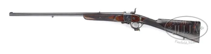 DANIEL FRASER HENRY STYLE DROPPING BLOCK SINGLE SHOT RIFLE. SN 1539. Cal. 500-450 No. 1. 27″ Ovate bbl w/ Metford rifling, has one standing, 1 folding express rear sight w/ longitudinally dovetailed high silver bead front. Top is file cut to full length except where it is engraved “Danl. Fraser & Coy. 4 Leith St. Terrace Edinburgh”. Bottom of bbl has London black powder proofs, and is stamped “.450” and w/ SN “1539” (ca 1885). Completely unadorned action has London view mark on left side. Cranked lock plate w/ rear sliding stalking safety is engraved “Dan. Fraser & Co.” Face of action under forend is stamped w/ SN and letter “A”. Trigger guard has SN on grip. Dark nicely figured European walnut buttstock measures 14-1/4″ over checkered steel butt plate w/ sling eye and 20 LPI checkering w/ mullered borders. Forend is fastened w/ pin and checkered to match buttstock. CONDITION: Fine. Rifle appears to be old London quality refinish. Bbls retain virtually all of purplish brown w/ areas of wear at muzzle. Case hardened action has bright color, and shows silvering at rear of lock plate, and on trigger guard. Proof mark is very sharp. Breech block is polished bright. All screws are heat blued, and show some use. Bore is strong, sharp and shiny but w/ pitting toward breech. Lock is crisp. Safety works well. Wood shows most of oil finish w/ few minor nicks. Although this action appears identical to a Henry action, there is no indication by any markings that it is of Henry’s production. It appears to be that Fraser had an order for a hammer rifle, and this is what he came up with. Possibly one of a kind. 4-35854 MGM113 (6,500-7,500)
