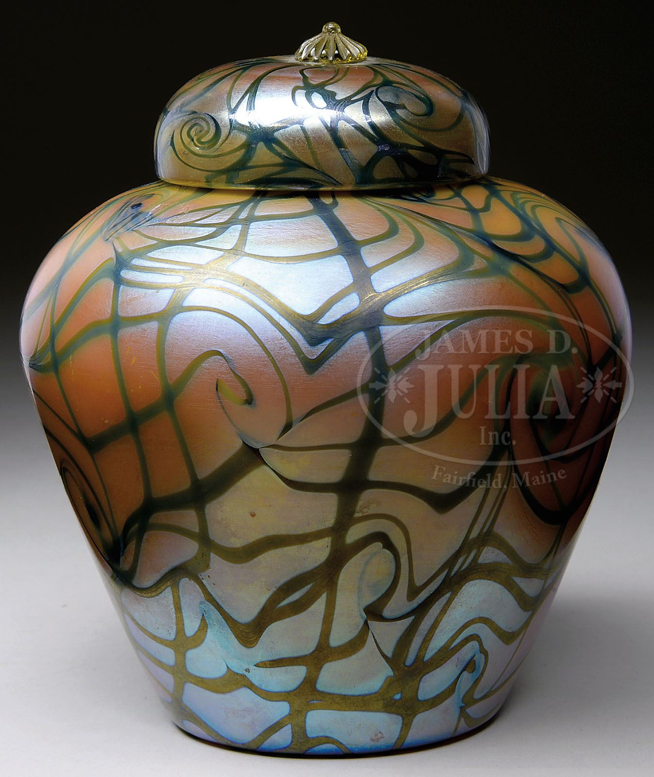DURAND COVERED JAR. Durand covered jar is decorated with a green coil pattern against a gold iridescent background. The matching lid is finished with an applied amber glass reeded finial. Unsigned. SIZE: 6-1/2″ t. CONDITION: Very good to excellent. 5-66864 (1,000-1,500)