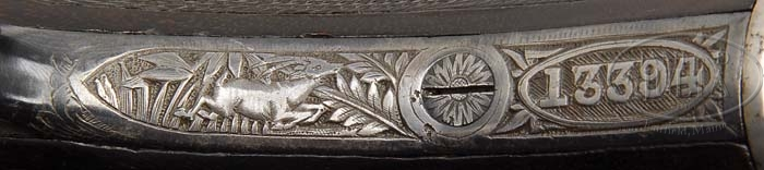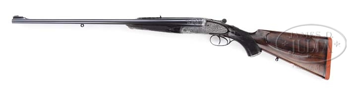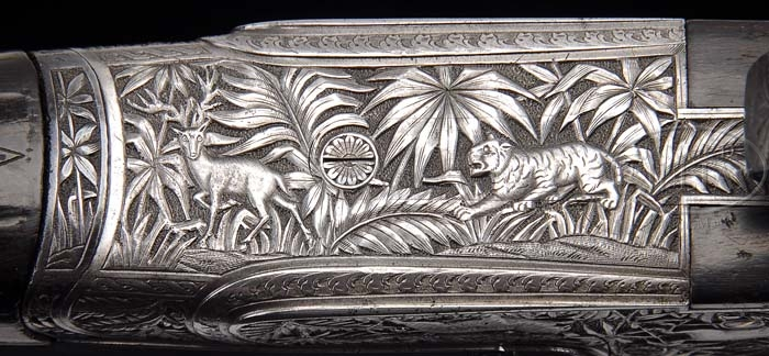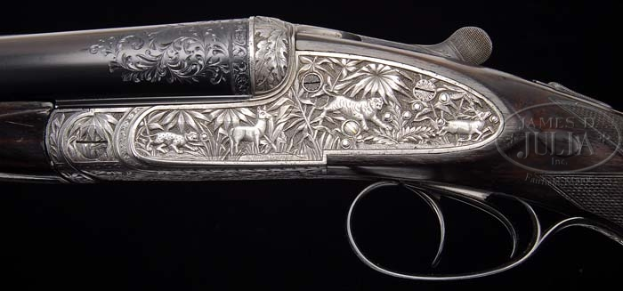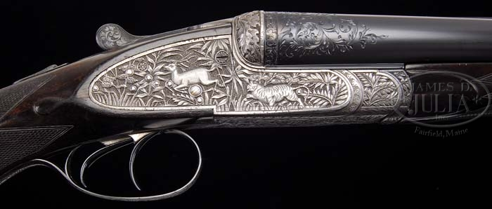 *R. B. RODDA MODEL DELUXE RELIEF ENGRAVED SIDE LOCK EJECTOR DOUBLE RIFLE. SN 13394. Cal. 450/ 400 3″ Nitro Express. 24″ Chopper lumb bbls have file cut quarter rib with dolls head and third bite extension, and express sight with one standing, and 4 folding leaves with platinum lines for 100, 200, 300, 400, and 500 yards. 300 yard leaf also has notation “Charge 100/ 360”. Silver front bead with flip-up moon bead is longitudinally dovetailed into nicely filed raised base with matted top. Mid rib is inlaid in gold “Modelle – De – Luxe.” Tops of bbls are inlaid in gold “R. B. Rodda & Co. 2. Wellesley Place. Calcutta.” and “& 24. Whittall Street. Birmingham.” Breeches of bbls have decorative bands of engraving with 2″ triangles of open flowing scroll. Bbl flats have Birmingham nitro proofs for 400 express, 60 grains cordite,and 400 grain bullet. Bottoms of bbls have provisional proofs and SN. Sling eye is soldered to bottom rib. Full side lock action features automatic safety with “Safe” inlaid in gold, bushed strikers, and square shouldered dolls head third fastener with sliding bite. Action is profusely engraved with high relief shaded vignettes of Indian game animals, somewhat naive in concept, depicting rather corpulent tigers stalking various antlered game in stylized jungle background of palm fronds and grass. Fences are engraved in high relief oak leaves. Trigger guard depicts tiger on bow with running antelope, and SN on tang which extends to engraved steel grip cap. Dense, dark, slightly streaked European walnut full pistol grip buttstock measures 14-3/4″ over Silvers type pad, and features shadow line right hand cheek piece, gold oval with monogram “PNS”, sling eye, drop points, and 20 LPI flat top checkering with mullered borders. Matching splinter forend attaches to bbls with front latch. Drop at heel: 2-1/4″, drop at comb: 1-3/16″. Weight: 10 lbs. 3.8 oz, LOP 14-3/4″. CONDITION: Very good, as refurbished. Bbls retain virtually all of a London quality re-black, with some old pitting evident on quarter rib and sights. Action and lock plates are coin finished with some pinprick pitting evident on fences, and around lock plates where they contact wood. Stocks retain most of an old oil finish, a bit dry. Action is tight. Bbls are on face. Ejectors are in time. Bores are good, strong rifling. Some throat erosion, and slightly frosted throughout. Some gas cutting on breech face of right bbl. A neat old rifle in a great caliber. Balances and handles well. 4-38347 MGM68 (20,000-30,000)
