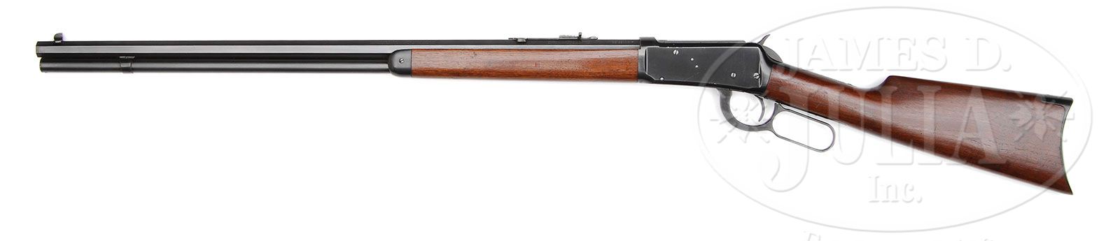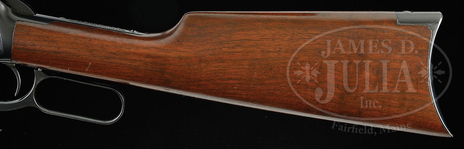 *LATE WINCHESTER MODEL 1894 LEVER ACTION RIFLE FROM THE WINCHESTER REPEATING ARMS COMPANY FIREARMS REFERENCE COLLECTION. SN 826609. Cal. 25-35. Standard grade rifle with 26″ oct bbl, full magazine, standard front sight and late style flat top rear sight. Mounted with uncheckered, straight grain American walnut with straight stock & crescent buttplate. Accompanied by a small zinc tag numbered “1135” on a brass wire loop which was the inventory number of this rifle in the Winchester Reference Collection. Also accompanied by a 1-1/2″ diameter brass disc marked “EWM” and “68”. No indication of what the brass tag was for. Very few arms from the Winchester Reference Collection have ever come to market. This rifle appears as item number 1135 in the Winchester Repeating Arms Company Firearms Reference Collection book as item number 1135 which is described as “model 1894 solid frame, 25-35, 26″ octagon barrel, plain standard gun, serial number 826609, gun assembled in 1916.” CONDITION: Extremely fine plus, probably unfired. Overall retains about 99% crisp orig factory blue with a couple of small spots of minor flaking on forend cap and some tiny nicks on right side of receiver with a small scratch and a few pinheads of flaking on right side of receiver & floorplate; lever, hammer, buttplate & forend cap retain about all of their crisp orig factory blue. Wood is sound with a very few, very scattered, very light storage & handling nicks & scratches and overall retains virtually all of its bright, crisp, orig factory finish. Mechanics are crisp, brilliant shiny bore, appears to be unfired, retaining virtually all of its bright blue on the bolt face & loading gate, showing no evidence of ever having been loaded. 4-47176 JR142 (6,000-10,000)