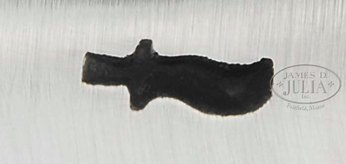 MATCHING PAIR OF UNUSED SCAGEL UTILITY KNIVES. This pair is from the Armand Durham collection and was never used. Matching pairs of Scagel knives are exceedingly rare, especially when they have never been used. Scagel made this pair for Armand and Margaret Durham in 1935, and like all of the knives Armand received from Scagel, they were put away and never used. The overall length is 12″, and the blade length is 7″. It has only the Kris mark, which is well-stamped. It has stag slab handles with 2 rivets, which are in mint condition, with no scratches, chips, or cracks. This pair is pictured in Scagel Handmade by James R. Lucie on page 153, in the lower right corner. PROVENANCE: Dr. Jim Lucie Collection. CONDITION: New, unused condition. They have all of the original Scagel grind lines showing. There are a few hazy-appearing storage marks on the blades, which prevent them from being classified as “mint”. Near mint is the appropriate term. 4-45559 JL2 (11,000-16,000)