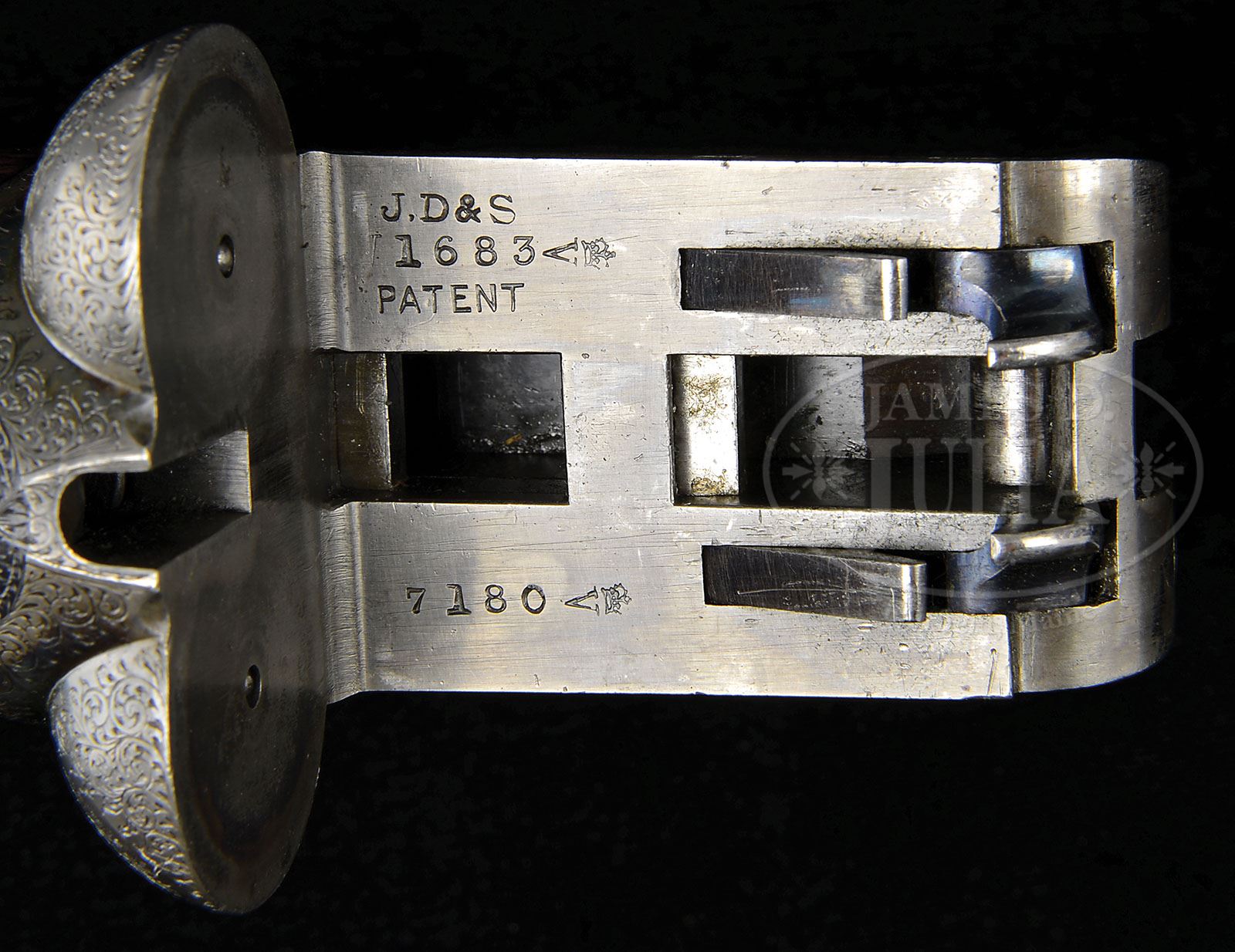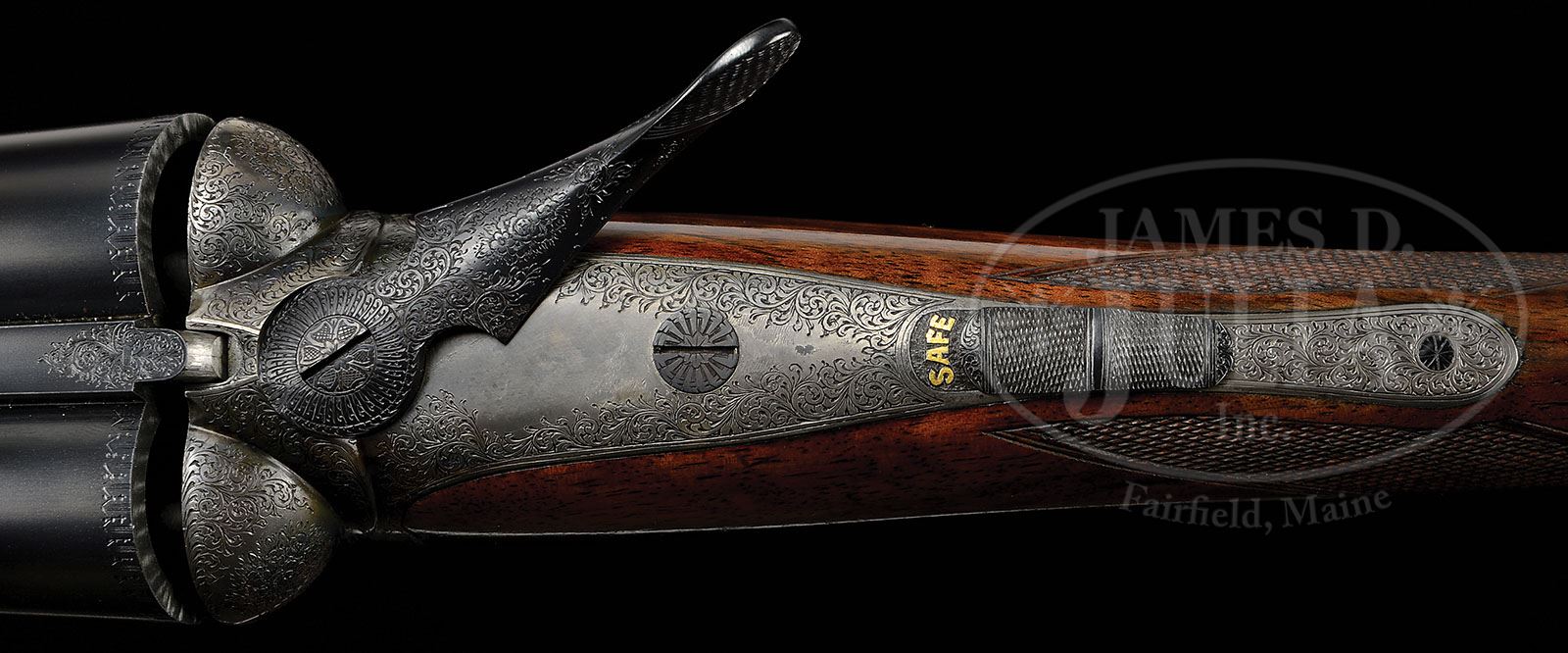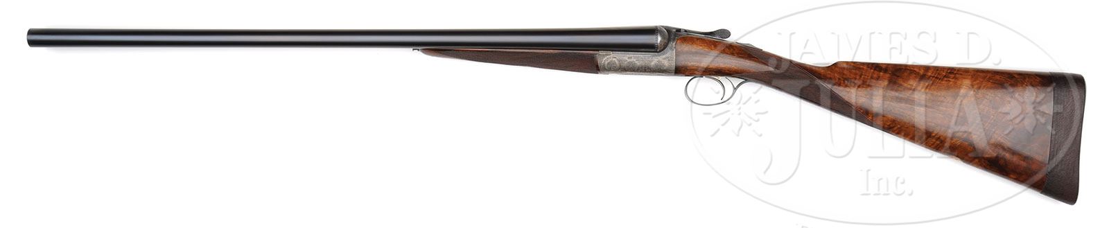 *JOHN DICKSON LIGHTWEIGHT ROUND ACTION SINGLE TRIGGER EJECTOR GAME GUN WITH CASE. SN 7180. Cal. 12 ga. 2-3/4″ Chambers. 26″ Chopper lump bbls are engraved “John Dickson & Son. 63 Princes Street Edinburgh” on swamped, concave, game rib, with third bite extension. Bbl flats are stamped with London nitro proofs for 2-1/2″ chambers. Bottoms of bbls are stamped with “Vickers Steel”. Classically filed, case hardened, round bar, trigger plate, ejector action is stamped with patent use number on water table (1683) and features pivoting bite third fastener, automatic safety (SAFE inlaid in gold), and has what appears to be orig, Boss single trigger marked “Boss’s Patent No 22894”. (Not listed in factory ledger.) Action is engraved with exceptionally well cut, small, shaded scroll with rose bouquet highlights. (Most of Dickson’s prewar engraving was done by Jack Sumner.) “John Dickson & Son” is on each side of action, and “Dickson’s Patent” is gold inlaid on bottom. Blued top lever, trigger plate, and single beaded, small bow trigger guard are also scroll engraved. SN is at grip. Finely figured and well marbled European walnut straight grip buttstock measures 14-7/8″ over 1-1/4″ brown leather covered pad. Stock features diamond hand, point pattern checkering with line borders, and a gold oval on toe line engraved with initials “R J H”. Matching splinter forend is marked with action patent use number on iron, and has Anson release. Bore diameter: left-.731, right -.731. Bore restrictions: left -.011 (Lt Mod), right -.007 (IC). Wall thickness: left -.023, right -.022. Drop at heel: 2-1/16″, drop at comb: 1-7/16″. Weight: 6 lbs. 1 oz. LOP: 14-7/8″. Makers leather case with brass corners, is embossed “W B M” on top, and interior is lined in dark green velvet, with large paper Dickson label on lid. Case contains 2-pc walnut and brass cleaning rod with mop, brush, and jag, a box of H & H cleaning patches, an H & H bench cloth, along with Dickson marked square oil bottle, and snap caps. PROVENANCE: Copy of factory ledger pages and cover letter from John Dickson & Son. CONDITION: Excellent, as partially refinished. Bbls retain nearly all of a fine satin re-blue, engraving a bit thinned. Action retains approx 70% orig case hardening color, quite strong where protected, silvered on fences, top tang, and bottom. Top lever, floorplate, and trigger guard are re-blued, and retain nearly all of that blue, engraving still quite good. Stocks retain nearly all of an older oil finish, with a few minor marks, wood slightly below metal of top tang. Pad is new. Checkering re-cut. Bores are excellent, with a hint of frosting and slight striations at breech ends. Action is tight. Bbls are on face. Ejectors are strong, and slightly out of time. Trigger works. Case leather is good, darkening, with considerable chipping of top grain on edges, and a number of light marks. Straps and handle are good. Interior cloth is very fine, with some soiling and compressions from gun, bbls, and dividers. Partitions are good. Accessories are very fine. Bench cloth is slightly soiled. A fine example of this iconic shotgun. 4-49188 MGM267 (12,500-17,500)