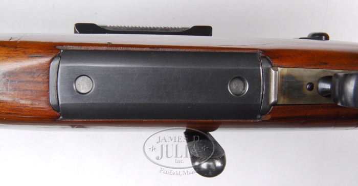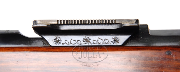 *MANNLICHER-SCHOENAUER 1903 CARBINE. SN 25711. Cal. 6.5 x 54. 17-3/4″ bbl, matted ramp with fine bead front sight, two-leaf rear sight, and stamped “R.C. Andrews” on left side of bbl just forward of rear sight. Receiver is marked on front ring “Made in Germany / Original / Mannlicher / Schoenauer / Kal:6.5 NORM”. Fitted with single lever side mount with 2-3/4 power ZIEL-DIALYT scope number 34976. Full length stock with steel nosecap, looped sling swivel, checkered forend, checkered pistol grip with horn gripcap, straight comb, left side cheekpiece, serrated steel buttplate with trap, 4-pc steel wiping rod, closed loop sling swivel, and double set triggers. PROVENANCE: Dr. Frank Miller Estate Collection. CONDITION: Very fine. Forend cap, bbl and receiver retains most of their original blue with a slight amount of muzzle wear and a few minor handling marks. Floorplate and trigger guard have nearly all of their original blue with trigger plate being a fine case color finish. Stock is solid with good checkering and just a few minor nicks and dings and retains most of its original factory finish. There is a minor repair at toe and a minor chip at edge of cheekpiece. Mechanics are crisp, including set trigger, and a nice shiny bore. Scope appears clear with posts reticle. 4-35746 BDT133 (2,000-4,000)