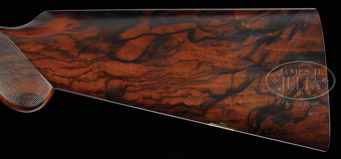 *CASED PAIR OF BROWNING B 25’s M1 GRADE SMALL BORE OVER AND UNDER SHOTGUNS. SN 324NP02931 & 324NP02932. Cal. 28 ga. Both guns with 27-1/2″ bbls, checkered solid ribs, sgl brass sighting beads, Teague chokes, ejectors, and sgl selective trigger. Both guns are engraved on left side of rib “BROWNING S.A. MADE IN BELGIUM” and right side “MOD B25 28 GAUGE 2-3/4”. Each gun has gold 1 or 2 on rib and top lever. The side plated receivers are beautifully engraved with foliate arabesque scrolls and shaded backgrounds. The plates and receiver body are bordered with a circle dot pattern, exposed forend metal and long tang trigger guard are engraved to match. The right side of each trigger plate is signed “V. GROJEAN”. Both guns are mounted in exhibition quality walnut, with drop points, checkered rnd knob pistol grips, checkered butts, gold oval engraved “JEN”, checkered schnabel 3-piece forends with each forend latch gold #1 or 2. Set 1) Bore diameter: top -.552, bottom -.551. Bore restrictions: top -SC, bottom -SC. Wall thickness: top -N/A, bottom -N/A. Drop at heel: 1-13/16″, drop at comb: 1-7/16″. Weight: 6lbs. 5oz. LOP 14-3/8″. Set 2) Bore diameter: top -.552, bottom -.551. Bore restrictions: top -SC, bottom -SC. Wall thickness: top -N/A, bottom -N/A. Drop at heel: 1-13/16″, drop at comb: 1-7/16″. Weight: 6lbs. 5oz. LOP 14-3/8″. The bottom flat of bbls are stamped “BSANY”. The pair of guns are housed in a 2 gun Motor case with canvas cover. Each gun is supplied with 5 Teague chokes, and a wrench. CONDITION: Extremely fine. Gun 1 retains 98% of its fine blue finish, with just a few minor handling marks. The polished case hardened receiver remains bright and clear with a possible few small handling marks. Stock is sound with sharp checkering, a few minor handling marks in its orig hand rubbed oil finish. There is a very shallow minor dent on right side near comb. Forend is sound with sharp checkering, a couple minor handling marks and retains virtually all of its fine hand rubbed oil finish. Gun 2 extremely fine, bbl retains 98% of its fine blue with a few minor handling marks and faint rub mark on bottom bbl from forend. Polished case hardened receiver remains bright, clear with possibly a few minor handling marks. Stock is sound with sharp checkering, some minor nicks & dings and retains virtually all of its fine hand rubbed orig oil finish. Forend is sound with sharp checkering, a couple minor handling marks and retains virtually all of its fine hand rubbed oil finish. Mechanics are crisp with non-auto safeties, strong ejectors and bright bores in both guns. Case and canvas cover are in excellent condition with some minor scuffing. 4-39538 BDT114 (25,000-35,000)
