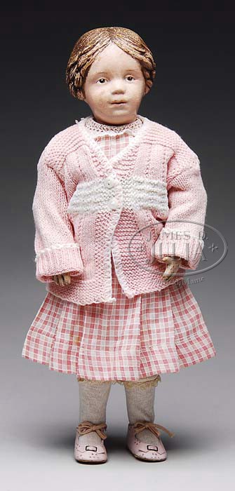 14-1/2″ SCHOENHUT GIRL DOLL. Girl with carved hair, painted pink bow in back holding braids, she also has brown intaglio eyes, pensive expression and is on her original fully jointed wooden body which is steel sprung. She has been appropriately redressed in a pink plaid cotton 1910-style dress, reproduction pink leather Schoenhut shoes with holes in the soles. SIZE: 14-1/2″ (37cm). CONDITION: Good. Face has had some retouch on forehead, nose, lips and cheeks. 1-9224 (600-900) Auction: Advertising, Toy & Doll - Spring 2009 Please Note: All prices include the hammer price plus the buyer’s premium, which is paid by the buyer as part of the purchase price. The prices noted here after the auction are considered unofficial and do not become official until after the 46th day. |
