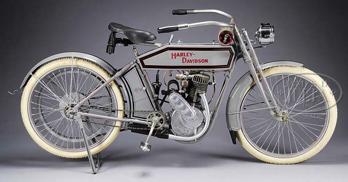 HARLEY-DAVIDSON SILENT GREY FELLOW MOTORCYCLE. Believed to be a 1912 model, but accompanying certificate of title from the State of Indiana indicates it as a 1911. One of the oldest and most sought after motorcycles by the undisputed king of motorcycles. Started in 1903 in Milwaukee, Wisconsin, this 1912 bike is a 5 horsepower, 35 cubic inch machine driven by a flat leather belt. Weighing in at approximately 195 pounds, this single speed bike had a top speed of 45 mph. This example has been lovingly restored with attention to detail, appearing to have used original and/or correct parts and pieces, but true aficionados should either examine in person or request additional photos, which will graciously be supplied. Engine is stamped with serial number 5945B on the cylinder head, matching the number on the marked Harley crank case. Bike is painted in gray, black, and red with Harley decals at various spots and resting on white balloon tires by Universal Tire Co. of Lancaster, PA. Old Troxel leather saddle seat and gas burning headlamp add to the charm of this early bike. SIZE: Approximately 83″ l x 40″ h x 31″ w. 24″ rims. CONDITION: Untested, but visually very good to excellent restored condition. 1-10577 (25,000-35,000) Auction: Advertising, Toy & Doll - Spring 2011 Please Note: All prices include the hammer price plus the buyer’s premium, which is paid by the buyer as part of the purchase price. The prices noted here after the auction are considered unofficial and do not become official until after the 46th day. |