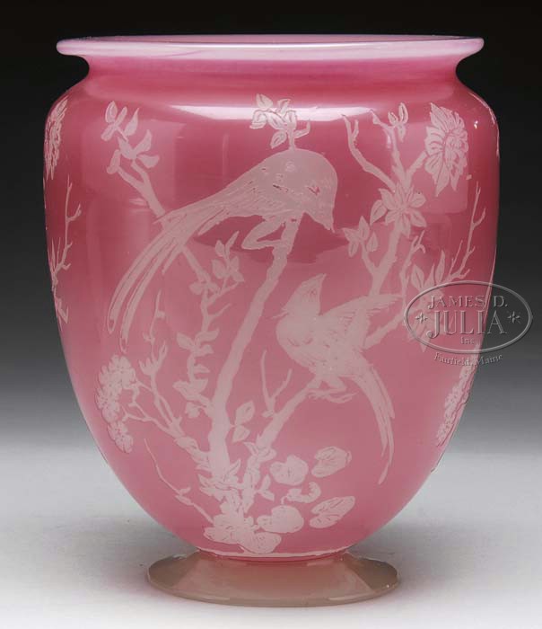 STEUBEN ACID CUT BACK VASE. Large urn shaped vase of Rosaline glass has an alabaster foot and is decorated with an acid cut back design with birds amongst foliage and branches. Unsigned. SIZE: 9″ t. PROVENANCE: From the Private Collection of Dorothy Lee Jones. CONDITION: Very good with roughness at pontil area and minor scratches to Rosaline finish. 5-61816 (600-900)