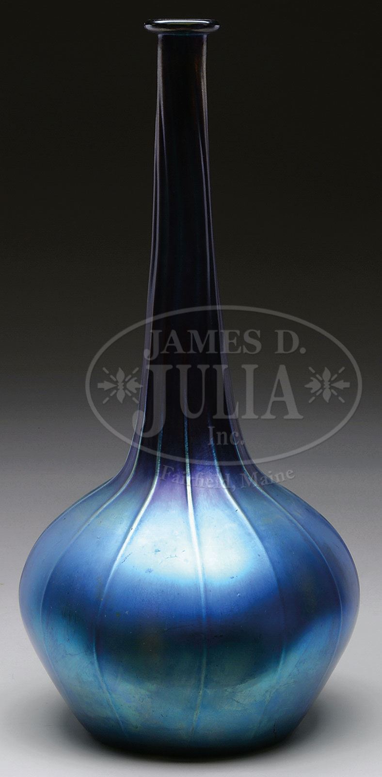 MONUMENTAL DURAND VASE. Monumental genie bottle design has vertical ribbing and a rich blue iridescent finish. Unsigned. The vase is pictured in the book Durand: The Man & His Glass by Edward J. Meschi on pg. 99, illus. 429. SIZE: 18-1/2″ t. CONDITION: Very good to excellent with a few minor scratches to iridescence. 5-66891 (1,000-1,500)