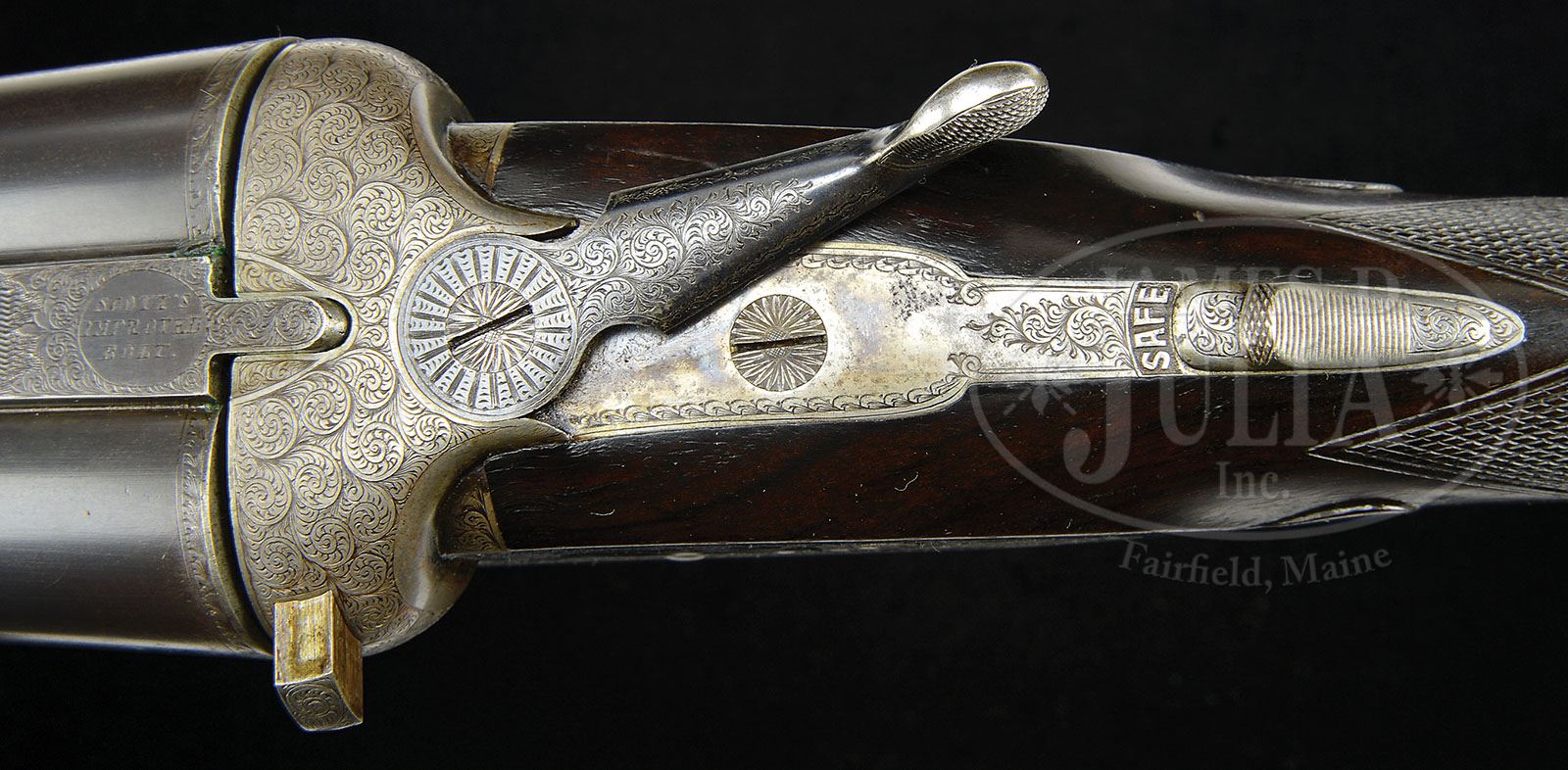 Additional Information: W.C. Scott information letter states total production of 10 ga. Monte Carlo B guns is estimated at less than 100. *W & C SCOTT MONTE CARLO – B HEAVY GAME OR WATERFOWL GUN. SN 70528. Cal. 10 ga. 2-7/8″ Chambers. 30″ Dovetailed steel bbls with broad, flat, matted rib, engraved “Scott’s Improved Bolt” at breech end, are engraved “W. & C. Scott & Son” “MONTE CARLO B” and “78 Shaftesbury Avenue. London. England” on tops. Bbl flats are stamped with Birmingham nitro proofs for 1-1/2 oz of shot. Bottoms of bbls are stamped with SN and bottom of right bbl engraved “Special Steel B”. Case hardened sidelock action with rounded bar features automatic safety (SAFE relief engraved), square crossbolt third fastener, Scott patent gas checks, and double triggers. Action is engraved with about 80% coverage cleanly cut medium scroll with near full coverage on fences. Lockplates are engraved with matching scroll and oval vignettes of pigeons in flight, as well as “W & C Scott & Son” at the bottom of each plate. Scroll engraved trigger guard has SN at grip. Dense, closely streaked European walnut semi pistol grip buttstock measures 13-3/4″ over brown “Old English” pad, and features drop points, flat top point pattern checkering, and a vacant silver oval on toe line. Matching short, splinter forend has Scott’s patented pull down lever release. Bore diameter: left-.775, right -.775. Bore restrictions: left -.040 (Full), right -.032 (Mod). Wall thickness: left -.044, right -.041. Drop at heel: 2-13/16″, drop at comb: 1-7/16″. Weight: 10 lbs. 1 oz. LOP: 13-3/4″. CONDITION: Very fine plus. Bbls retain 90 – 95% orig blue, silvered on sharp edges, and thinning at normal carry point. Action and lockplates retain most of their orig case hardening color, quite vivid where protected. Top lever retains most of its blue, silvered on thumbpiece. Trigger guard retains traces of its orig blue. Stocks retain most of their orig finish with numerous light marks and minor dents, checkering slightly worn. Replacement pad needs some cleaning up. Bores are excellent. Action is tight. Bbls are on face. A well balanced, solid, working ten bore. 4-48693 MGM59 (4,500-6,500)