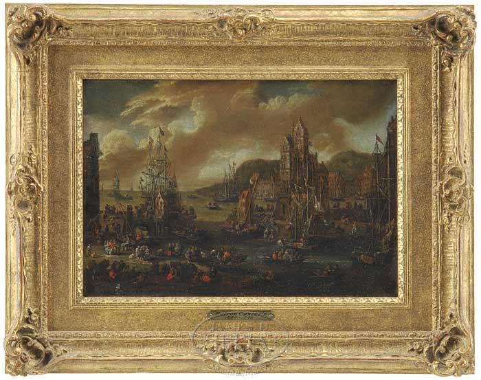 ATTRIBUTED TO PIETER CASTEELS, III (Flemish 17th-18th Century) TWO WORKS; BUSY MEDITERRANEAN HARBOR SCENES. Unsigned oil on canvas scenes show a very busy harbor with tall buildings; large ships being tended to by many people in small boats as well as on land. Housed in replacement gilt fancy frames. SIZE: 8-1/2″ x 12″. CONDITION: Inpainting, surface having a thick varnish. 9-26418 (10,000-20,000)