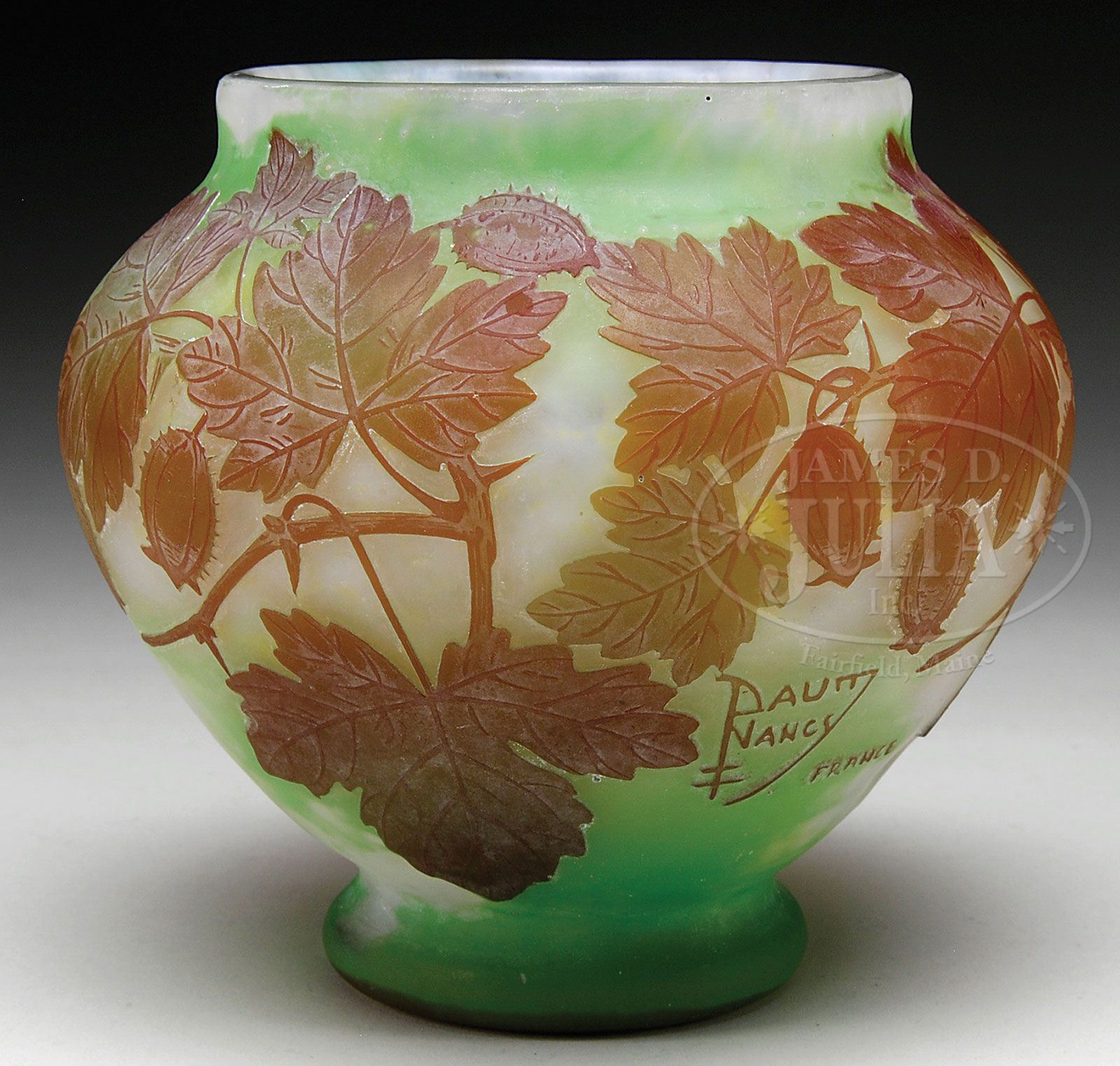 DAUM NANCY FRENCH CAMEO VASE. Daum vase has brown cameo decoration of leaves and thorned stems with prickly seed pods all set against a mottled green, yellow and white background. Vase is signed on the side “Daum Nancy” with the Cross of Lorraine “France”. SIZE: 6″ t x 6″ dia. CONDITION: Very good to excellent. 5-65654 (500-700)