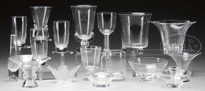 STEUBEN CRYSTAL LOT. Lot consists of three tumblers, one mug, two goblets; one with controlled bubble stem, seven vases, two candlesticks and two bowls. Most pieces are signed with etched script “Steuben”. CONDITION: Very good to excellent. 5-61695 (500-700)