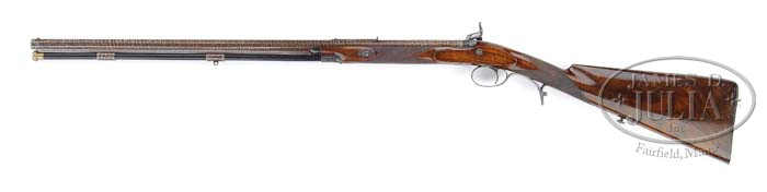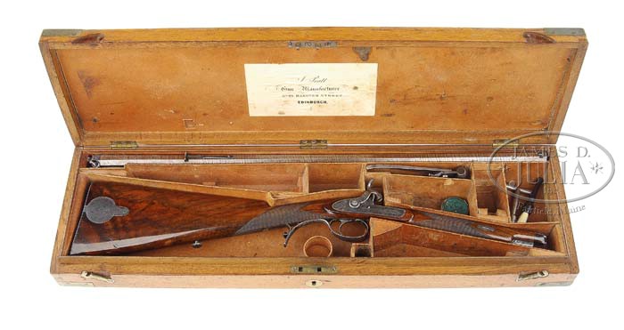 SUBLIME J. PRATT MINIATURE PERCUSSION STALKING RIFLE WITH ORIGINAL CASE AND ACCESSORIES. SN 248. Cal. 45. 26″ Octagonal Damascus barrel has multi-groove rifling, and is engraved “J. Pratt 28 Hanover Street Edinburgh” on top flat w/ nicely filed adjustable rear sight, and transversally dovetailed front. Bottom of bbl has London provisional and view proof marks, and no. “248”. Breech plug also has view mark and no. 248. It features a platinum line inlaid at rear, and plain vented platinum “blow out”. Center rod pipe has sling eye. Ebony ramrod has bulbous brass top, and brass bottom w/ worm under cap. Lock plate is engraved w/ open scroll and “J. Pratt”. Hammer has matching scroll, dolphin head, and is filed similar to Purdey style rifle hammers. Safety bolt is mounted in front of hammer. Breech iron has very finely executed shaded open scroll, w/ shell motif near hook. Trigger guard extends into a pistol grip, and is engraved w/ scroll and grip area is checkered. Trigger plate extension ends in stylized pineapple. Thimble is nicely filed, with some engraving. Forend tip is horn. Very nicely marbled Circassian walnut stock has a steel long tang butt plate w/ open scroll on tang, and a round patch box engraved w/ running roe deer. There is a sling button on toe line, and checkering is approx 20 LPI w/ mullered borders. This dainty little rifle weighs only 3-3/4 pounds, yet is of large enough caliber to be legal for deer. Quartered oak case has nicely shaped inset brass corners, a brass central medallion, brass pivoting hooks, and key lock. Interior is lined in textured leather, and has paper “J. Pratt Edinburgh” label. Accessories include William Davis improved no. 50 round ball mould, t-handled nipple key, and an ebony handled brush. CONDITION: Very good. Bbl retains 90% of a very distinct brown showing off twist pattern quite well. Sights retain most of their fire blue. Case hardened parts are mostly gray. Traces of fire blue on trigger guard, with butt plate showing about 30%. Stock retains most of its French polish finish. There is a repair on left side of forend where side nail escution mounts. Bore is bright and shiny. Rifling is sharp. Case is fine, some lacquer on brass, few marks and scuffs in wood. Interior is complete, partitions are tight. Leather lining is good, w/ a few marks and scuffs. Label is good, w/ a few abrasions and mark from hammer screw. Accessories are good. This is a scarce Scottish rifle of very high quality. 4-37412 MGM13 (9,000-12,000)
