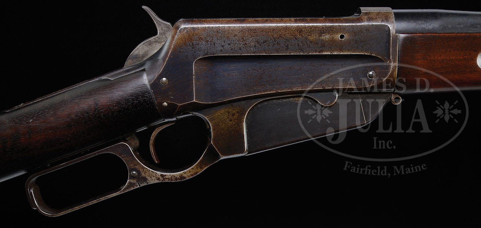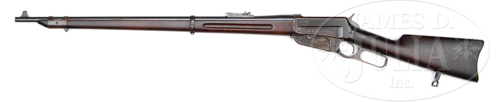 EXTREMELY RARE TRANSITIONAL WINCHESTER MODEL 1895 LEVER ACTION MUSKET. SN 2369. Cal. 30 US (30-40). Usual musket configuration with 28″ tapered rnd bbl, pedestal mounted ivory bead front sight and 1,800 yard musket ladder rear sight. Receiver is transitional style with a lightning, weight reducing machined recess on each side that does not extend all the way to the rear of the receiver. It also has the “new” jointed lever. Mounted with very highly figured, uncheckered American walnut with full length forearm with grasping grooves & straight stock and carbine/musket buttplate with trap containing a brass cleaning jag & brush. Buttstock is mounted with an articulated musket swivel. Corresponding sling loop is missing from the middle band and the stacking swivel is missing from the front band. Front band is Krag rifle style with split straps and has had the bayonet lug removed. Bbl has standard markings with the caliber over the chamber area and matted front receiver ring. Accompanied by copies of the Winchester ledger sheets which show that this rifle was serialized Dec. 14, 1896 as a musket in caliber 30, with knife bayonet & scabbard and shipped Jan. 25, 1897 to Order #24607. It was repaired & returned Feb. 17, 1898 with the notation “Receiver matted on top, fancy stock, S&S Bayt taken off, repo (repolish) rec”. A copy of the ledger sheet discloses that there were a total of five Model 1895 muskets shipped to the same order, #2363, #2369, #2371, #2382 & #2384, several of which were returned & repaired. It is unknown how many such transitional ’95 muskets were produced but it seems likely that there were only a few with not many of those surviving today, especially with fancy wood. Also accompanied by a Cody Firearms Museum letter which identifies this musket in caliber 30 with 28″ bbl, fancy stock, receiver matted on top, sling & swivel, knife bayonet & scabbard, new pattern special jointed lever, swivel eye for swivel in magazine, new 95-30 musket rear sight, Lee buttplate reduced, drop implement & brush (brass string pull-through), Lee stock swivel base, Lee sling swivels, dbl front band with saber stud, bayonet stud taken off, received in warehouse Dec. 16, 1896, shipped Jan. 25, 1897 with five other arms to Order #24607. Returned & repaired Jan. 6, 1898, Feb. 7, 1898, Feb. 11, 1898 and Feb. 17, 1898, one shipping date of Feb. 7, 1898. It is apparent from the multiple returns & repairs that this musket was probably a prototype or bench model being tested in the factory. Additionally accompanied by a 5-page letter from renowned Winchester historian & author, George Madis, wherein he authenticates this musket and states that in his opinion “This was an experimental gun, sent to the Winchester warehouse for storage and returned across Winchester Avenue for alterations requested by the U.S. Ordnance inspectors & engineers”. He further states that the matting on top of the receiver is “unique” and is possibly the first Model 1895 which had matting. He also states that this musket originally had the solid lever and “apparently the U.S. Ordnance Dept. wanted the improved lever latch which was a component of the jointed lever”. In a following paragraph he states that one of the other muskets in the shipment with this musket was number ‘2366’ which has the notation “reduced frame 8 pounds, and this musket, number ‘2369’, has ditto marks for the frame”. In the final paragraph he states “This is a unique Winchester; no other musket will be seen with so many unusual and special variations”. PROVENANCE: Barnes Family Collection. CONDITION: Very good to fine. Bbl retains about 95% strong orig blue with scattered light surface rust; receiver retains 50-60% blue turning brown with possible touchup on the left side, also left side of the cartridge box & lever; hammer retains dark case colors. Wood is sound and retains most of a professionally restored finish. Mechanics are fine, bright shiny bore. 4-47625 JR208 (12,500-17,500)