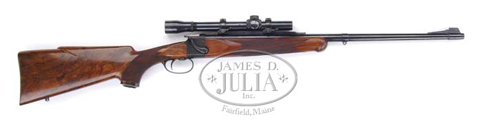 GRIFFIN AND HOWE SHELHAMER STOCKED CUSTOM MINIATURE FRASER 22 HORNET RIFLE WITH SCOPE. SN 1503. Cal. 22 Hornet. 24″ Barrel has stippled top quarter rib w/ inset G and H scope mounts and single folding gold line express sight for 100 yds. Band sling loop and banded stippled ramp front sight w/ sourdough bead is engraved “NO. 2037 Griffin & Howe, Inc. New York”. Bbl is mounted in miniature rook rifle size Daniel Fraser dropping block action w/ safety mounted in front of trigger and pin type take down system. Action is profusely engraved w/ Fraser shaded scroll w/ SN “1503” on trigger guard. Nicely marbled full pistol grip French walnut buttstock measures 14″ over a Neidner checkered steel butt plate w/ shadow line roll over cheek piece, horn grip cap, and “chin strap” grip to butt transition, typical of work by Thomas Shelhamer. (T. Shelhamer is stamped under butt plate w/ his work number “1063” penciled in.) Checkering is 26 LPI w/ single line border and wraps over top of grip and is beautifully executed. Schnable forend is attached to bbl w/ screw, and has wraparound checkering to match buttstock. Lyman All Weather Alaskan 2-1/2 Power SCOPE is mounted in 2 pc Griffin and Howe rings, front ring stamped w/ no. “2037.” Weight w/ scope: 7 lbs 3oz. PROVENANCE: Dr. Frank Miller Collection. CONDITION: Excellent. Metal retains virtually all of its blue. Stocks retain nearly all orig finish w/ few nicks and dings from handling. Bore is excellent. Scope is excellent w/ clear optics. As great an American Custom rifle as you could want. 4-35700 MGM116 (12,000-18,000)
